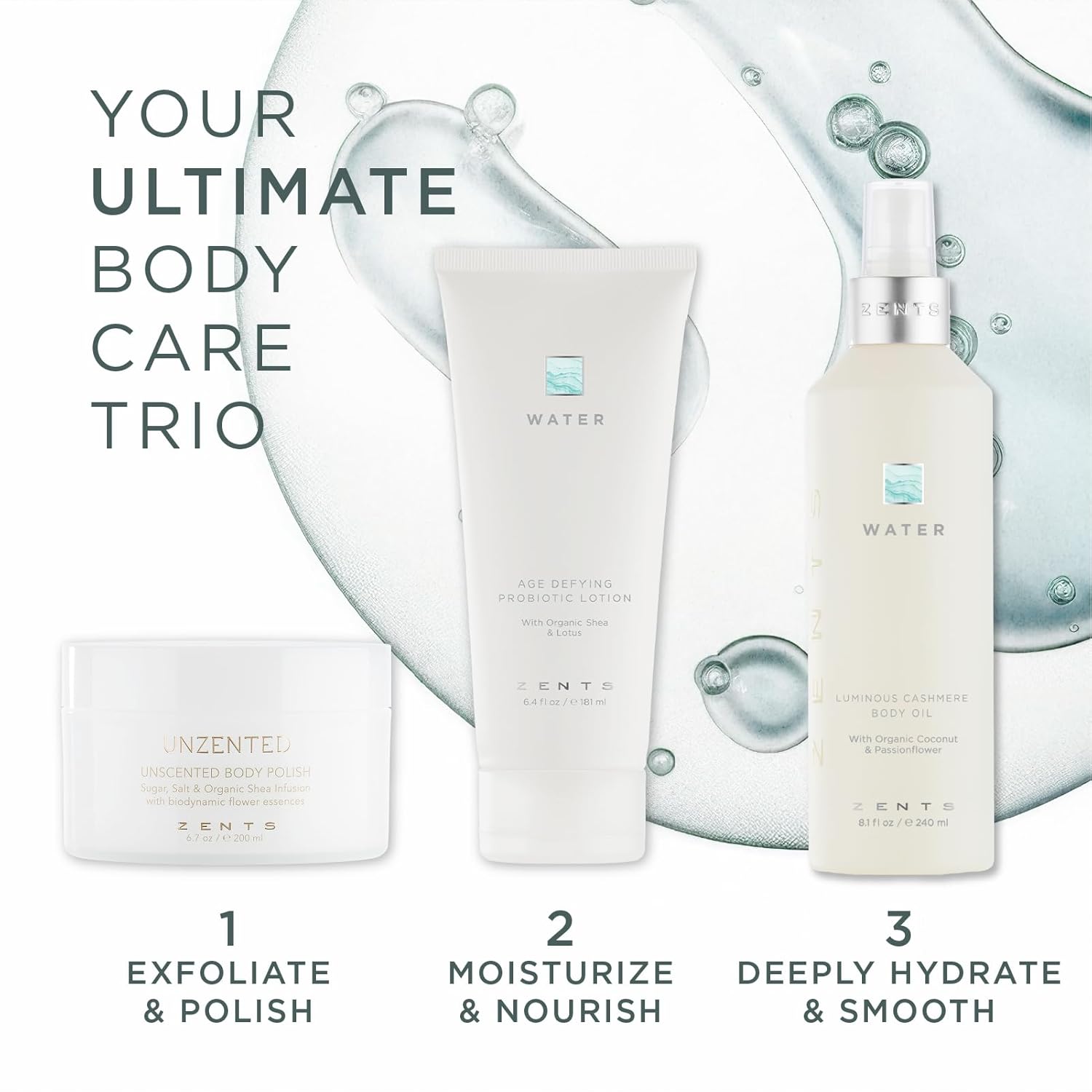 Zents Luminous Cashmere Body Oil (Water Fragrance) | Moisturizing Body Oil with Vitamin E & Organic Coconut Oil | Softens & Smooths Skin | 8 fl oz