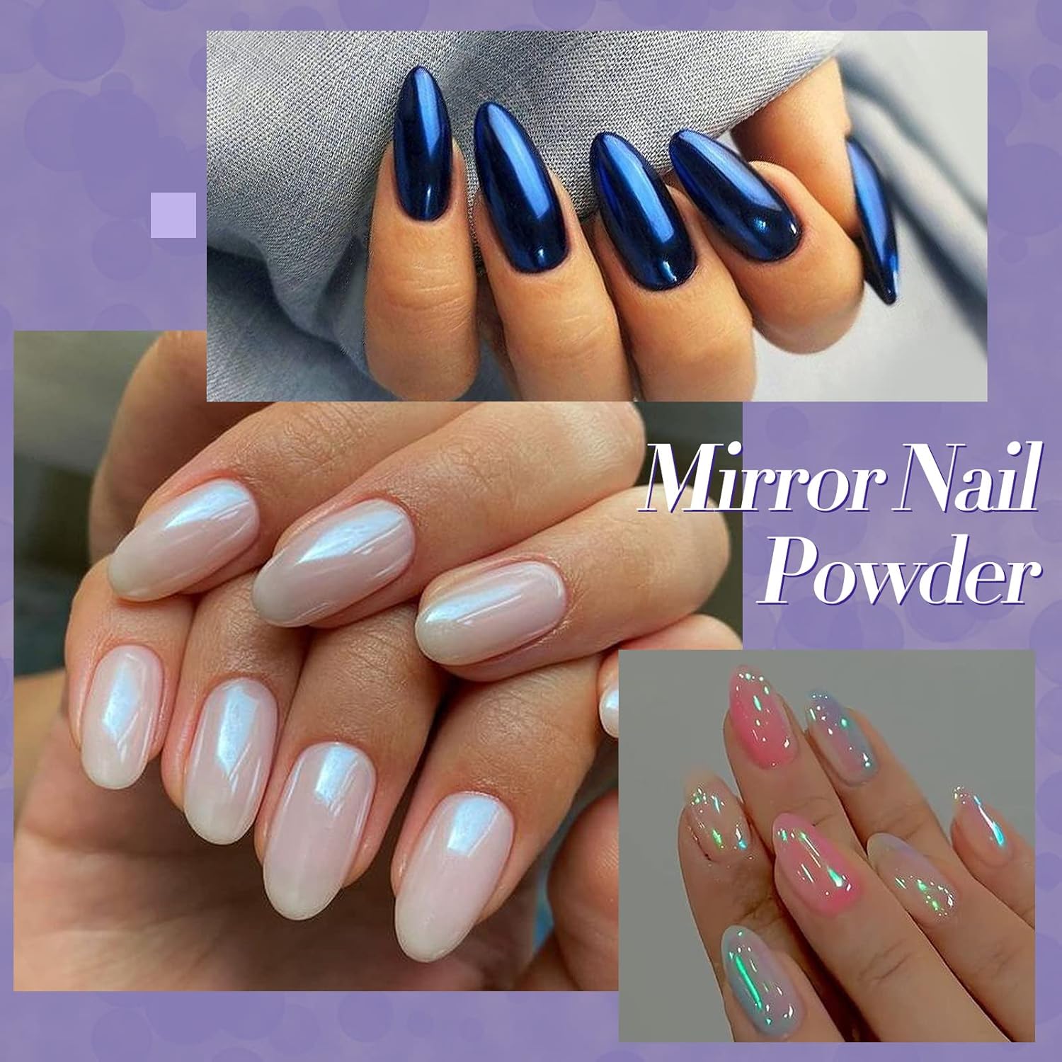 - WIDE APPLICATION: The colorful mirror nail powder is suitable to be applied on UV gel nails, acrylic nails, natural nails etc, a helpful DIY tool for nail art design. Different polish will give different actual effect.Trying different polish can also bring more fun to you with the chameleon powder.