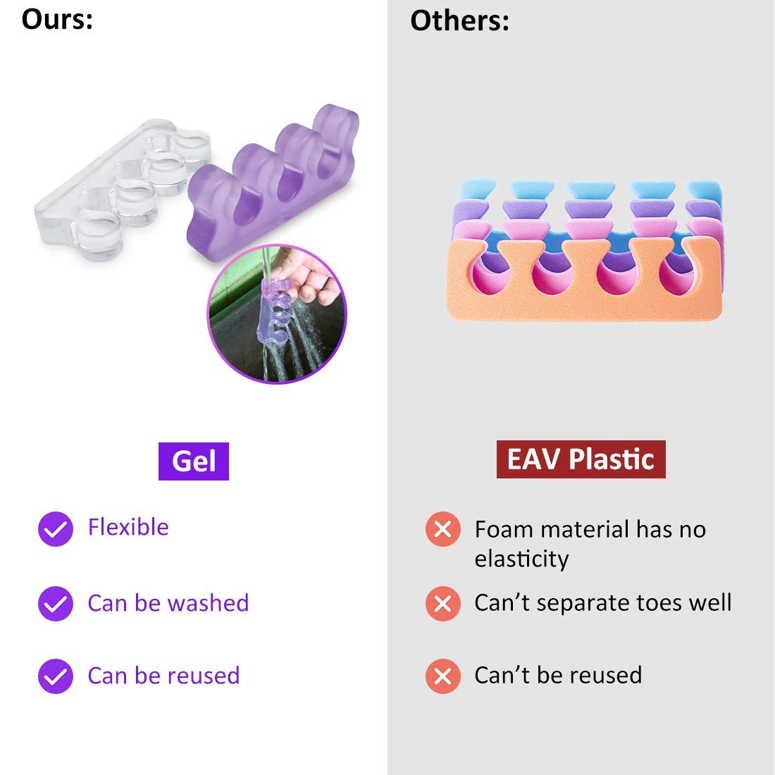- đăReusable For Easy Cleaningă: Toe separators can be repeatedly cleaned, and the jelly material that can be used multiple times is not easily deformed. An upgraded version of the foam toe separators pedicure.Wash with water once before use.
