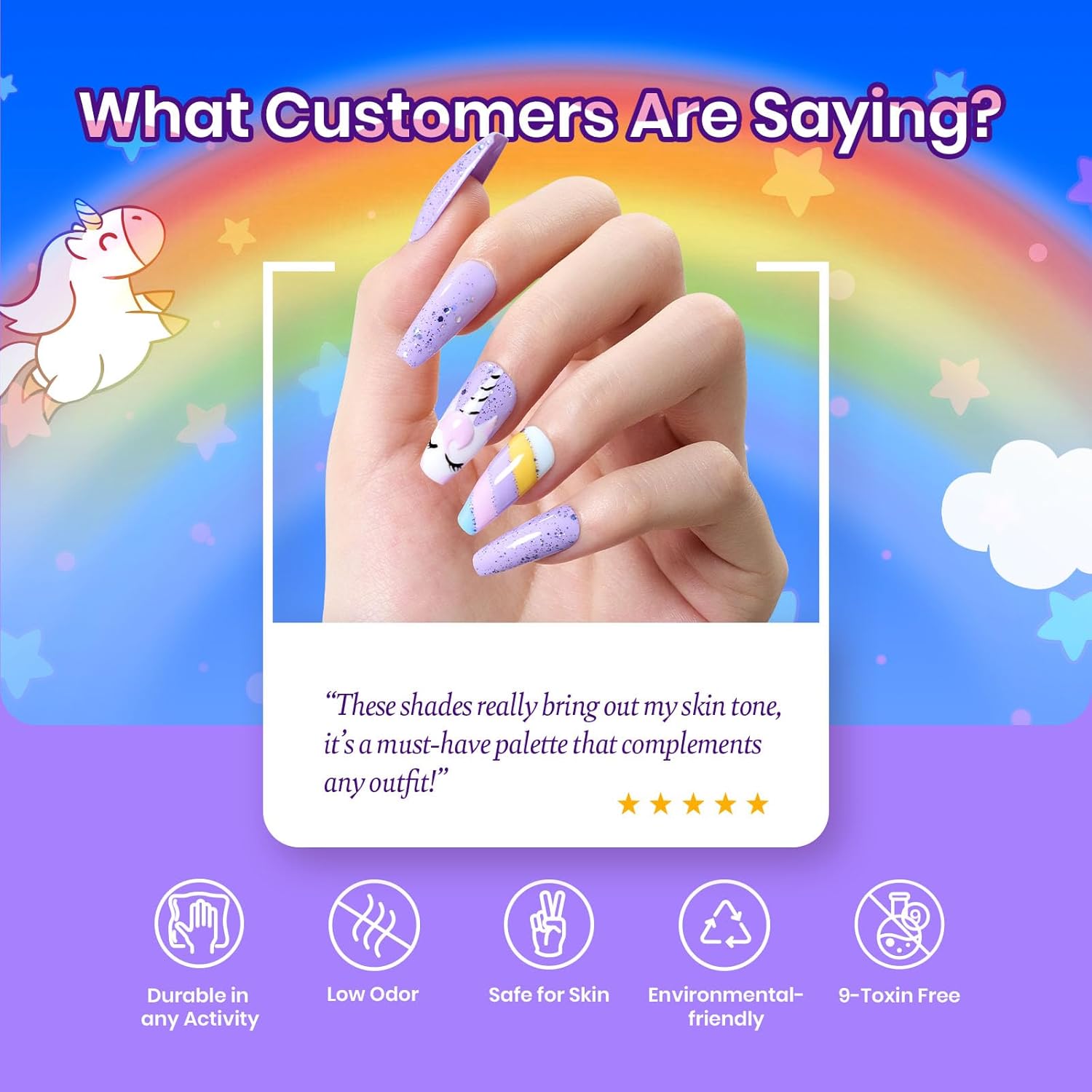 - Soak off LED Nail Dryer Gel Nail Polish: The 2024 unicorn gel nai polish kit beauty gift sets with red, neon orange, yellow, neon green, turquoise, baby blue, purple glitter nude pink gel polish set need to be cured under LED Lamp. Base and Top coat required. Average for LED Nail Lamp 60-120 secs.
