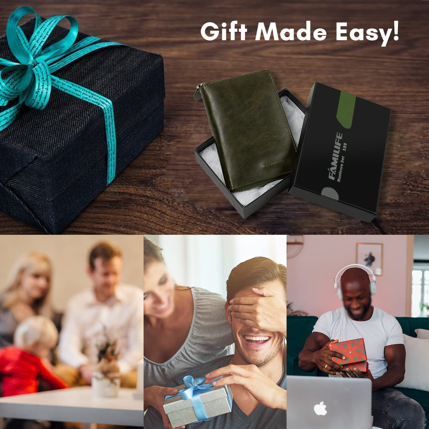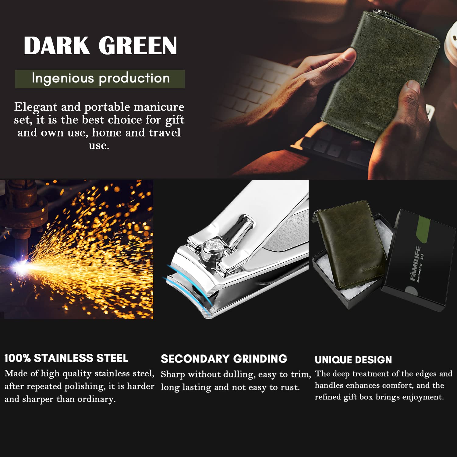 FAMILIFE Manicure Set, Professional Manicure Kit Nail Clippers Set 11 in 1 Stainless Steel Nail Pedicure Tools Kit Grooming Tool with Portable Green Leather Travel Case Luxury Gifts for Women and Men