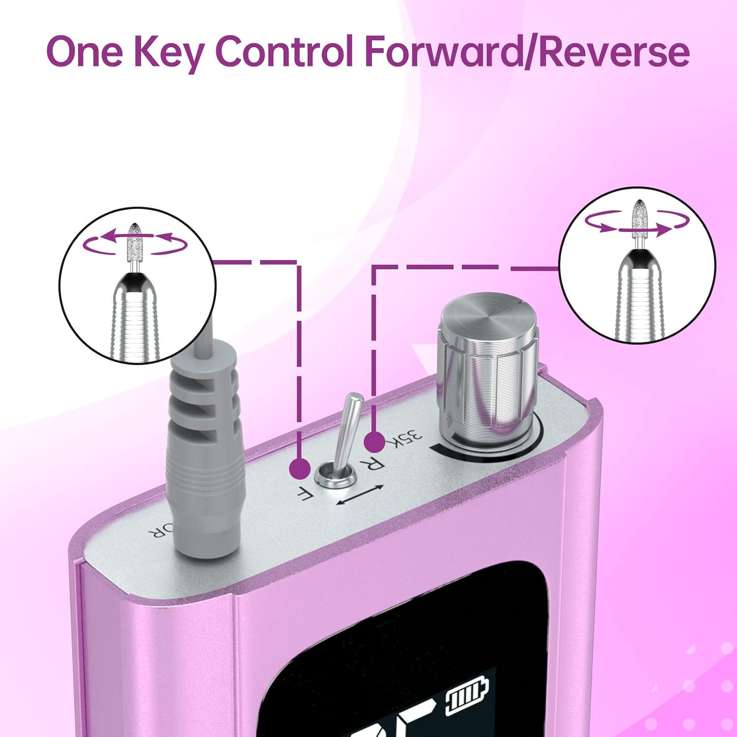- 【Easy to use】0 rpm option for fast start/stop. The toggle switch instead of a button for easy, straight-forward direction setting. Smart screen for monitoring the nail drill's speed, direction, and battery status