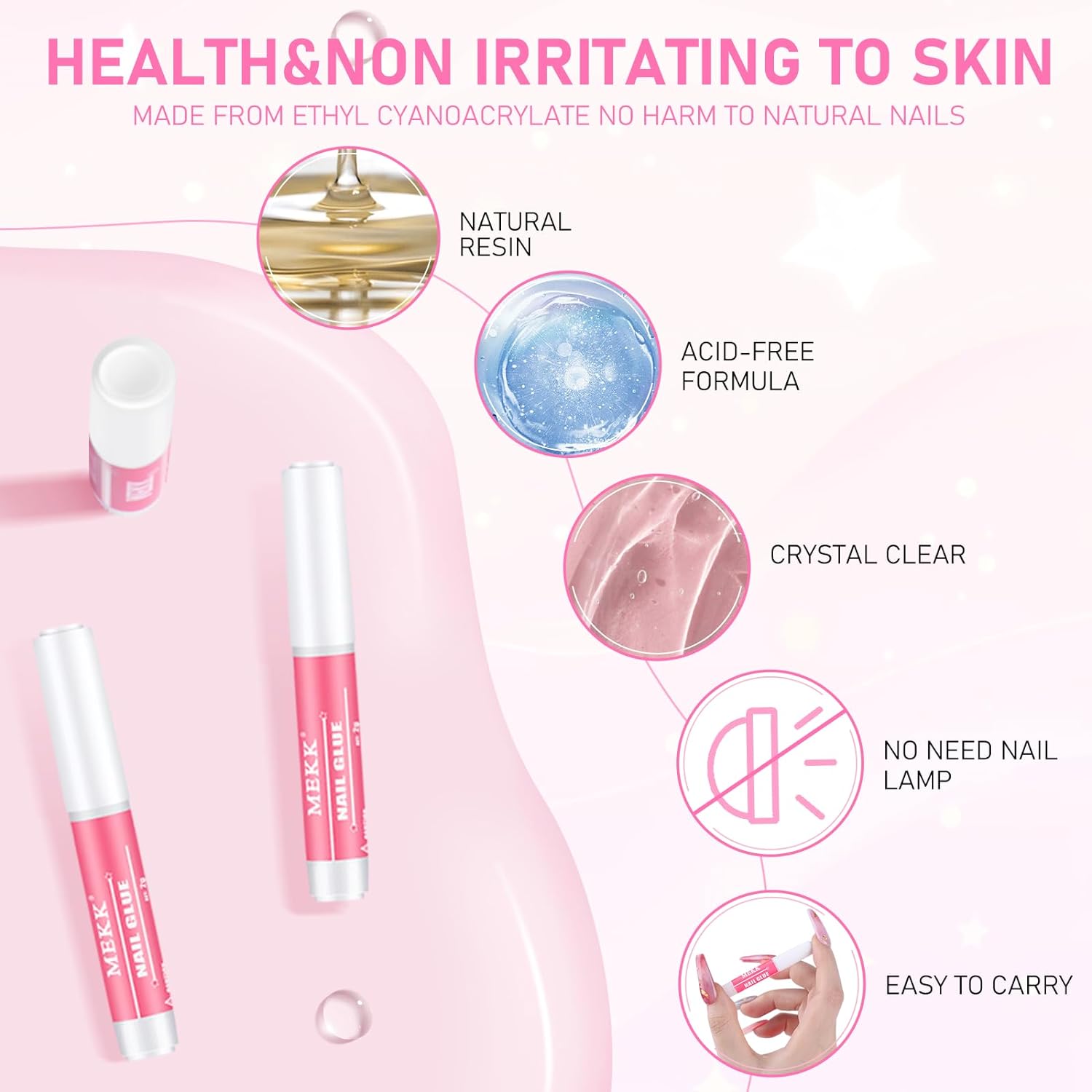- HEALTHY MATERIAL&WIDELY USES:MEKK nail glue is with MSDS and SGS certificated, made of natural resin, slight odor, no harm to your natural nails. Our nail glue is perfect for sticking press ons, acrylic nails,broken nails and small nail art decorations such as rhinestone, beads & gemstone. MEKK nail glue can bring the salon home.
