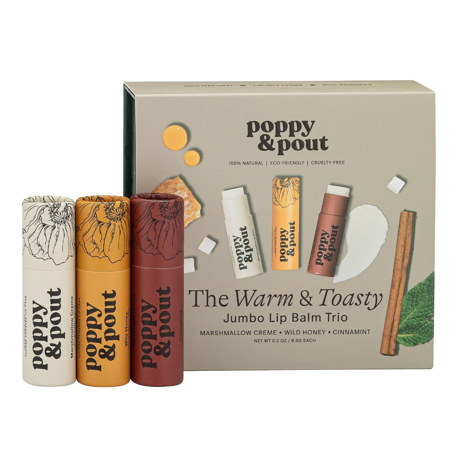 - WARM FLAVORS | This gift set includes 3 lip balm flavors: Wild Honey, Marshmallow Creme, Cinnamint. These cozy lip balms will keep you warm and toasty all year long!