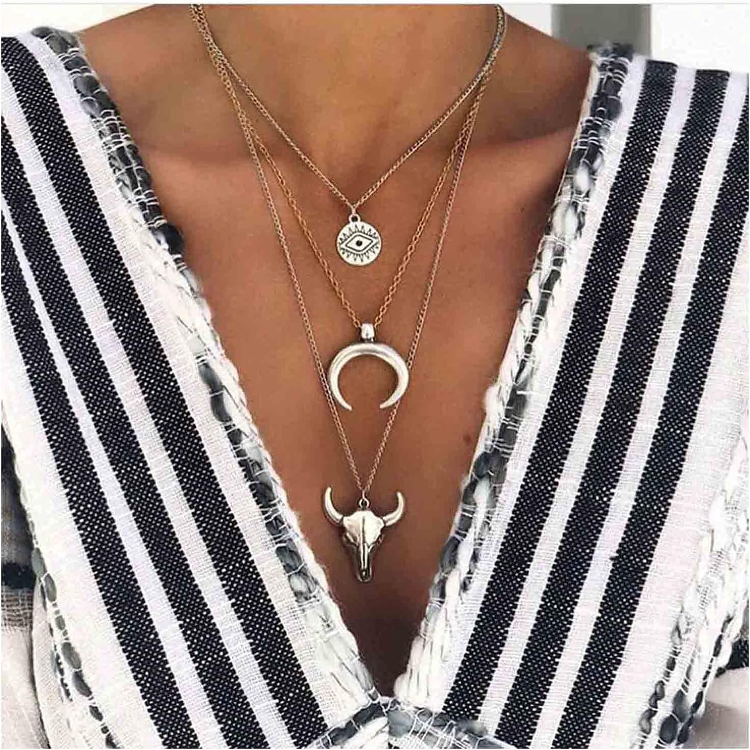 Boho Layered Moon Necklace Silver Compass Disc Pendant Necklace Chain Cow Evil Eye Charm Necklace Jewelry for Women