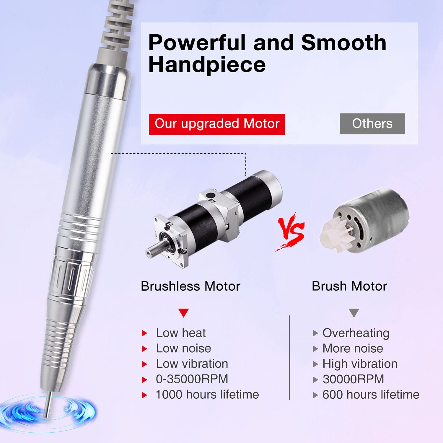 - 【Powerful 80W Brushless Motor】The handpiece is equipped with brushless motor, which is totally driven by magnetic force. Wear-free motor for long-term use, more than 1000h service time. It is quiet and smooth for comfort grip. Low noise for smooth and long-time operation. The professional nail drill with a unique safety protection system to avoid the motor excessive temperature rise.