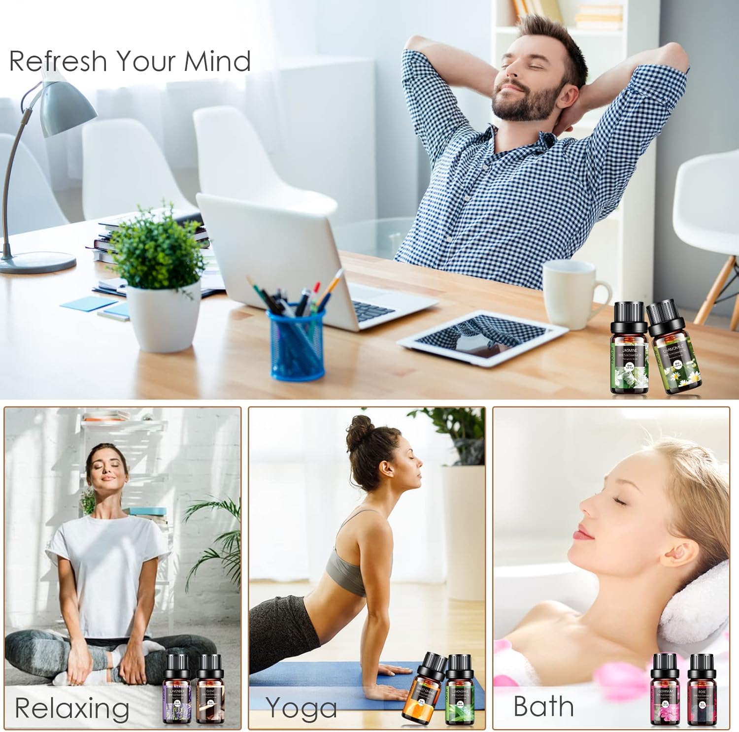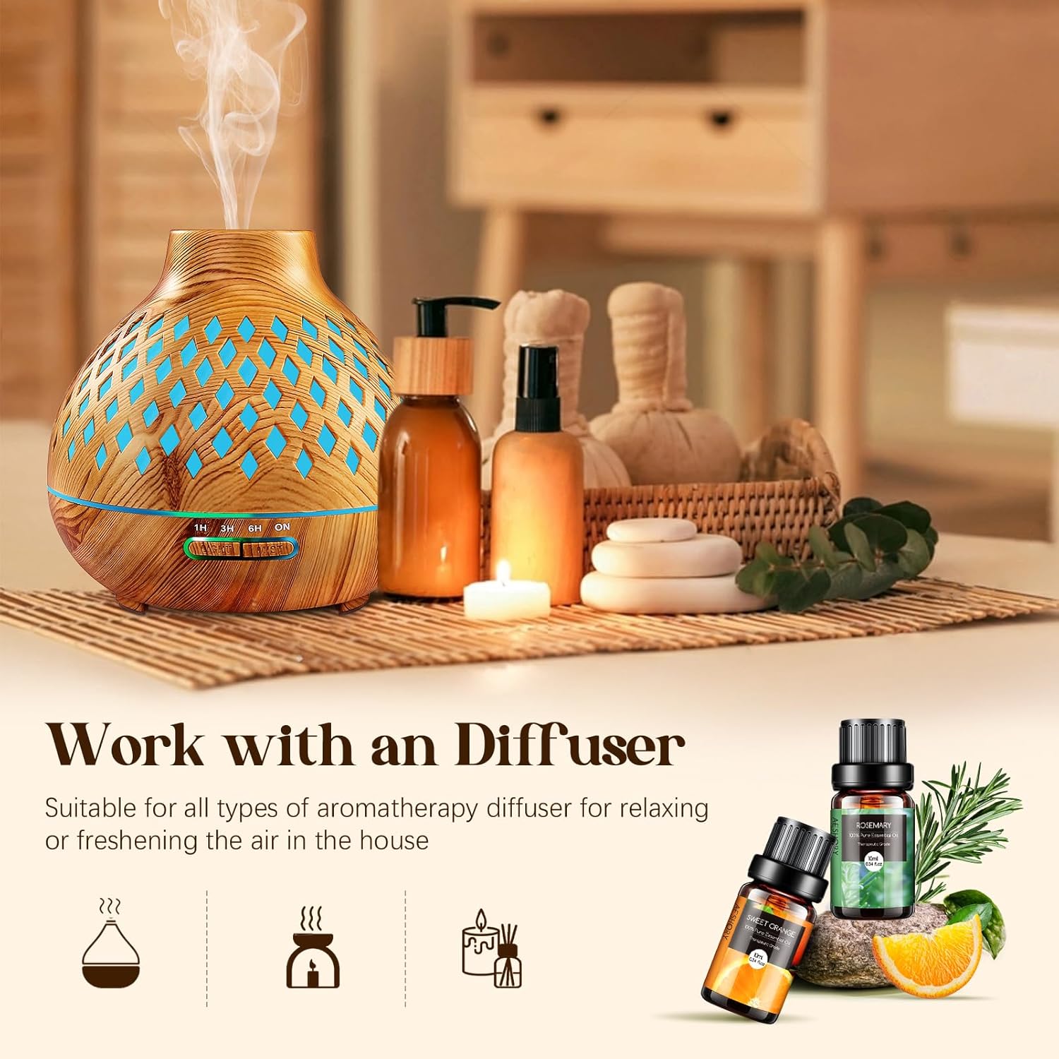 - šMulti-Use: Our essential oils always adopt rigorous quality control standards. Simply add a few drops to any aromatherapy diffuser and fill your entire room with that aroma. And suitable for humidifier, aromatherapy, steam inhalations, hair or skin care, massage, bath, saunas, air freshening, home fragrance (bedroom, living room, bathroom, study room), office (workstation, conference room), yoga room and spa, etc.