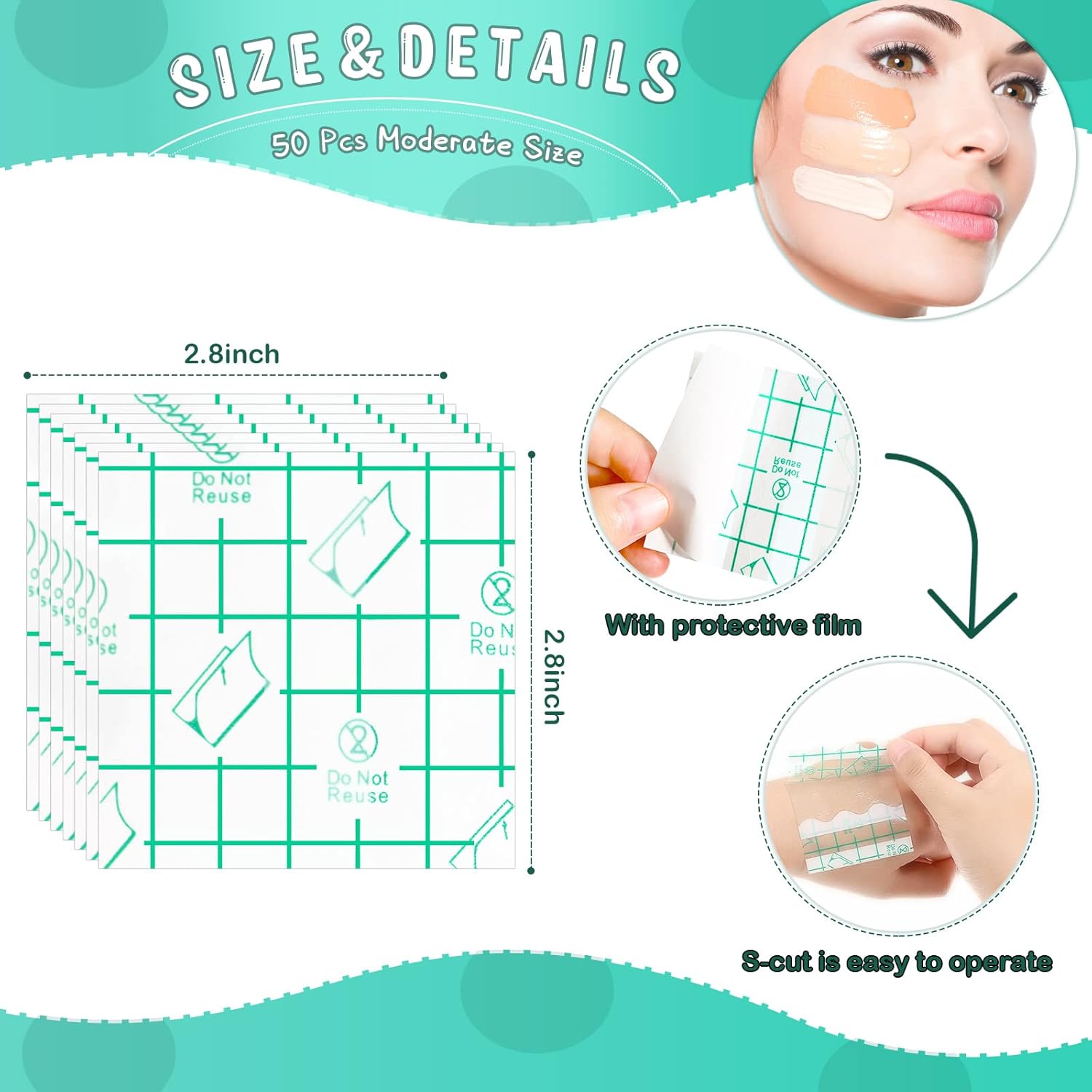 - More possible usages: the adhesive dressing tape can be applied as a disposable palette, which is clean for makeup artists, also you can use it to cover your small wound, waterproof material to protect your skin from water, allows your shower or swimming as usual