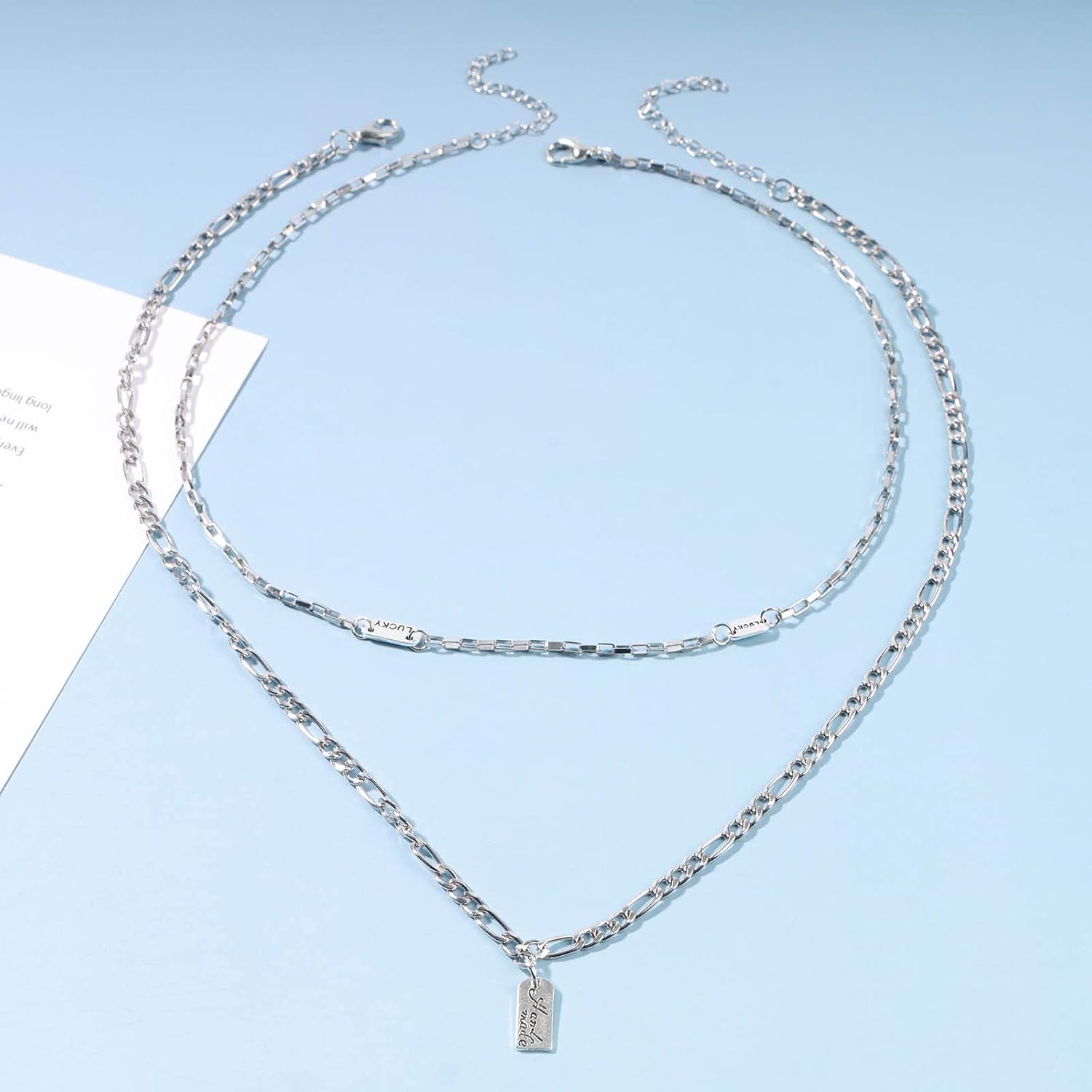 Boho Layered Silver Bar Necklace Choker Figaro Chain Necklace Vintage Layering Link Chain Necklace Geometric Necklace Jewelry for Women and Girls