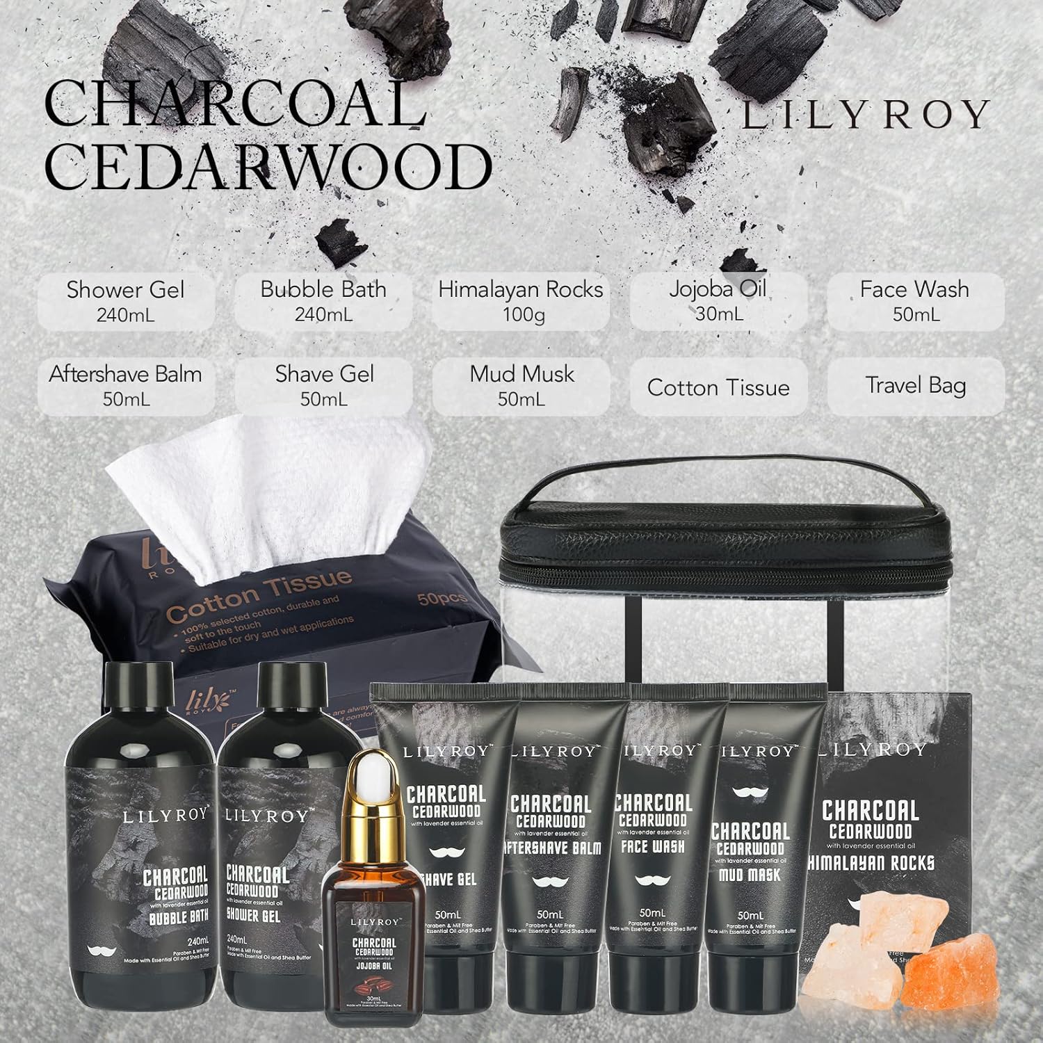 - CHARCOAL CEDARWOOD SPA GIFT BASKET: This gift set for your lover with our Charcoal Cedarwood fragrance has a cool, woody, fresh flavor. Body wash and bubble bath helps prevent body odor and have a long-lasting unique scent of wood