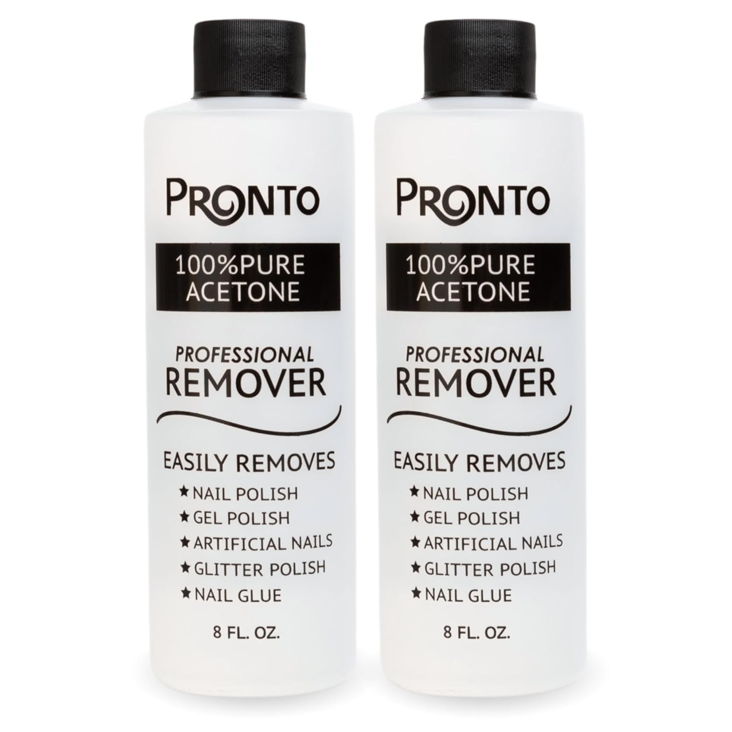 - PREMIUM QUALITY PRODUCT: Our Pronto fingernail polish remover is proudly made in USA, using 100% pure acetone to effectively and efficiently remove all types of manicure and pedicure. Products are sealed, and are available in 4, 8 and 16 Fluid Ounces.