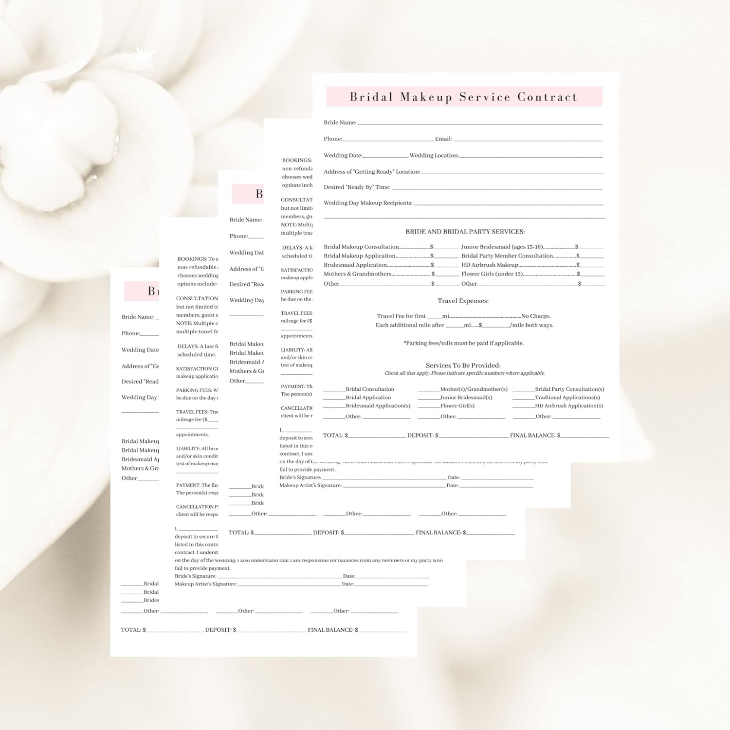 Bridal Makeup Service Contract | 100 Pack | 8.5 x 11" A1 Forms | Makeup Artist Supplies | Bridal Contract | White and Pink Forms