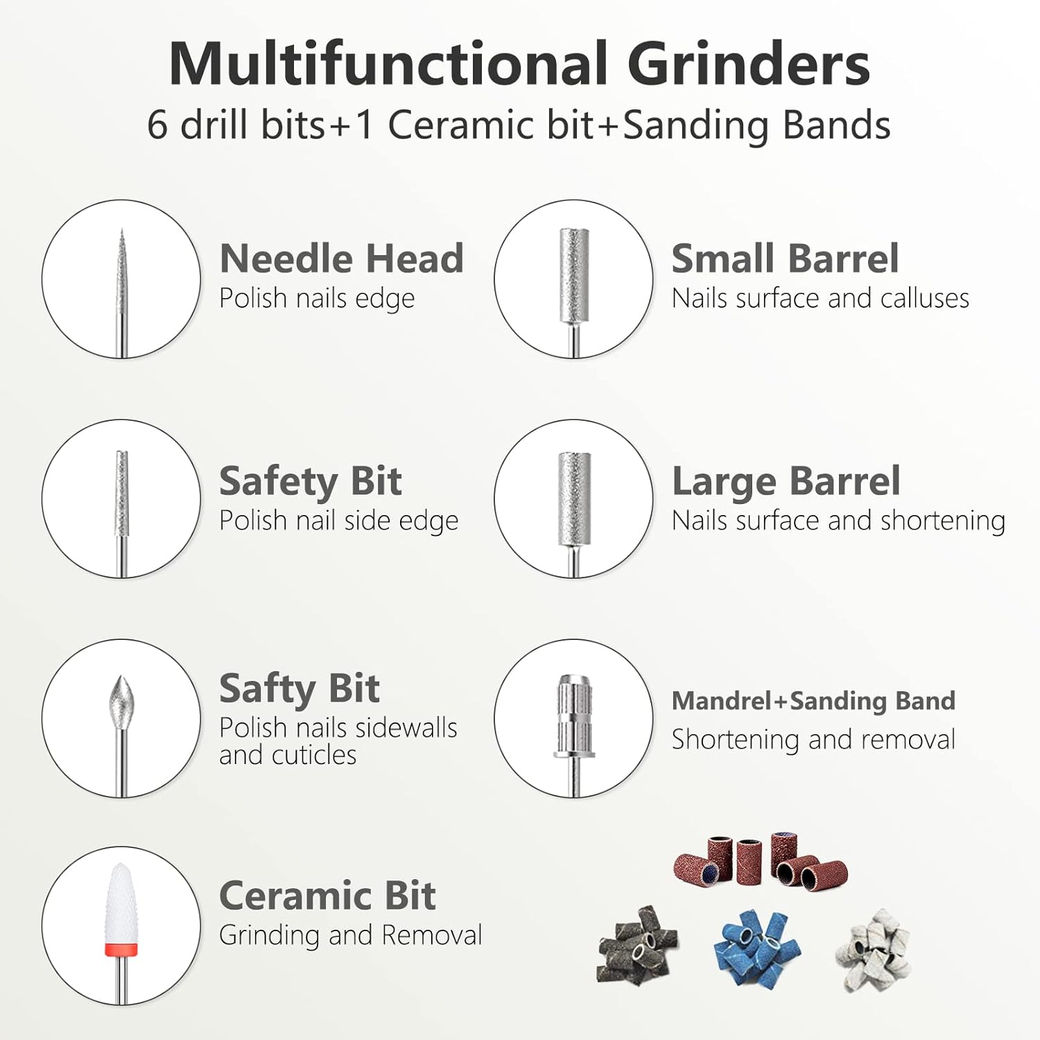 - Professional Electric Nail Drill Kit: This electric nail drill kit includes 6 metal bits and 1 ceramic bit designed for acrylic nails, gel nails, dip powder, thick nails, cuticles, and calluses—one set for comprehensive manicure and pedicure care.