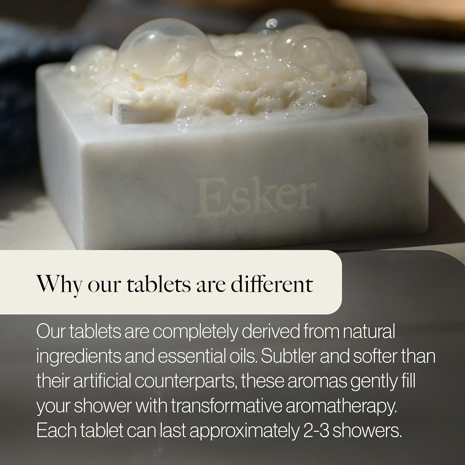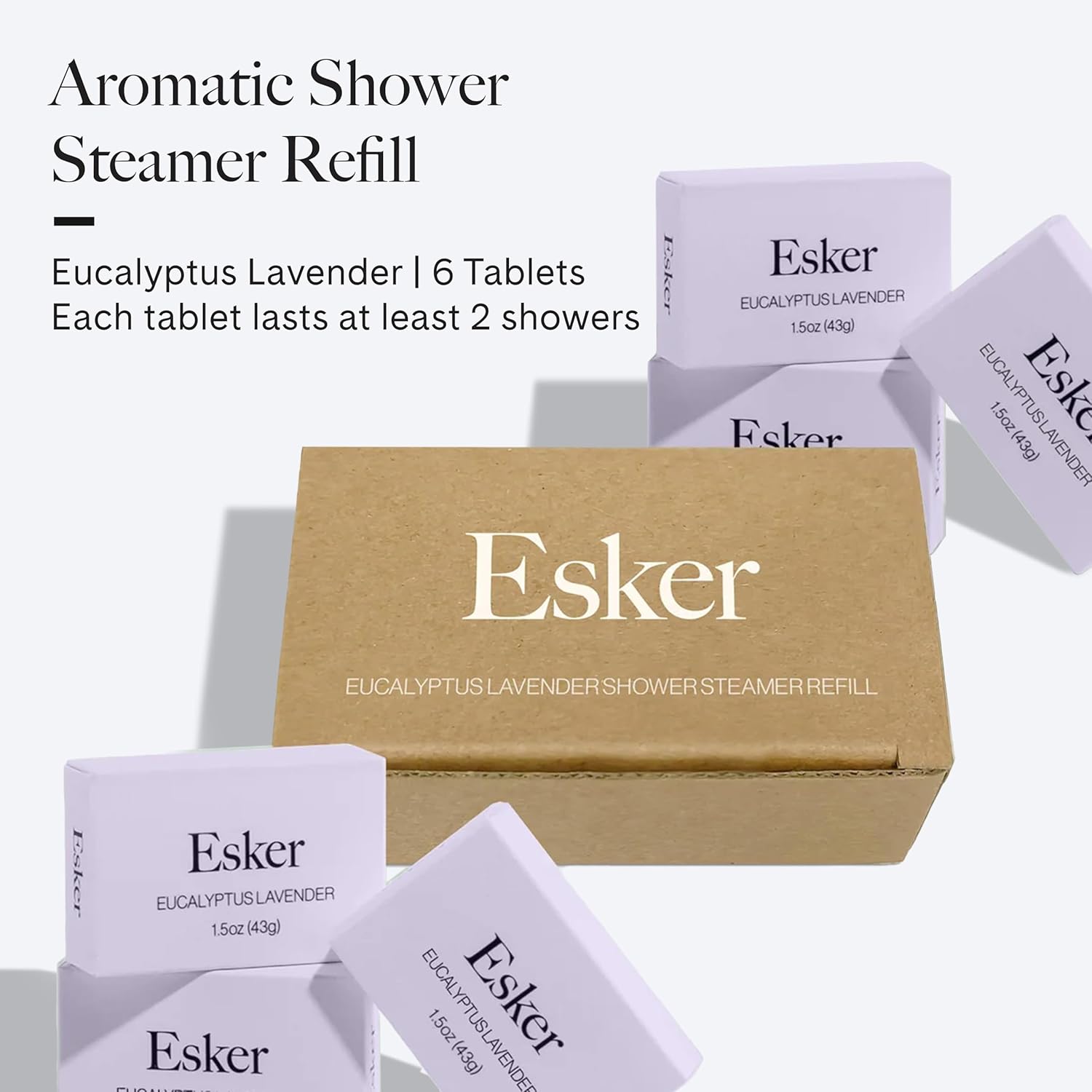 - Shower Experience: Elevate your shower experience with Esker's Shower Steamer Refill in Lavender Eucalyptus. These all-natural tablets, steam, and water-activated, release refreshing essential oils and minerals into the vapor, turning your shower into a daily ritual.