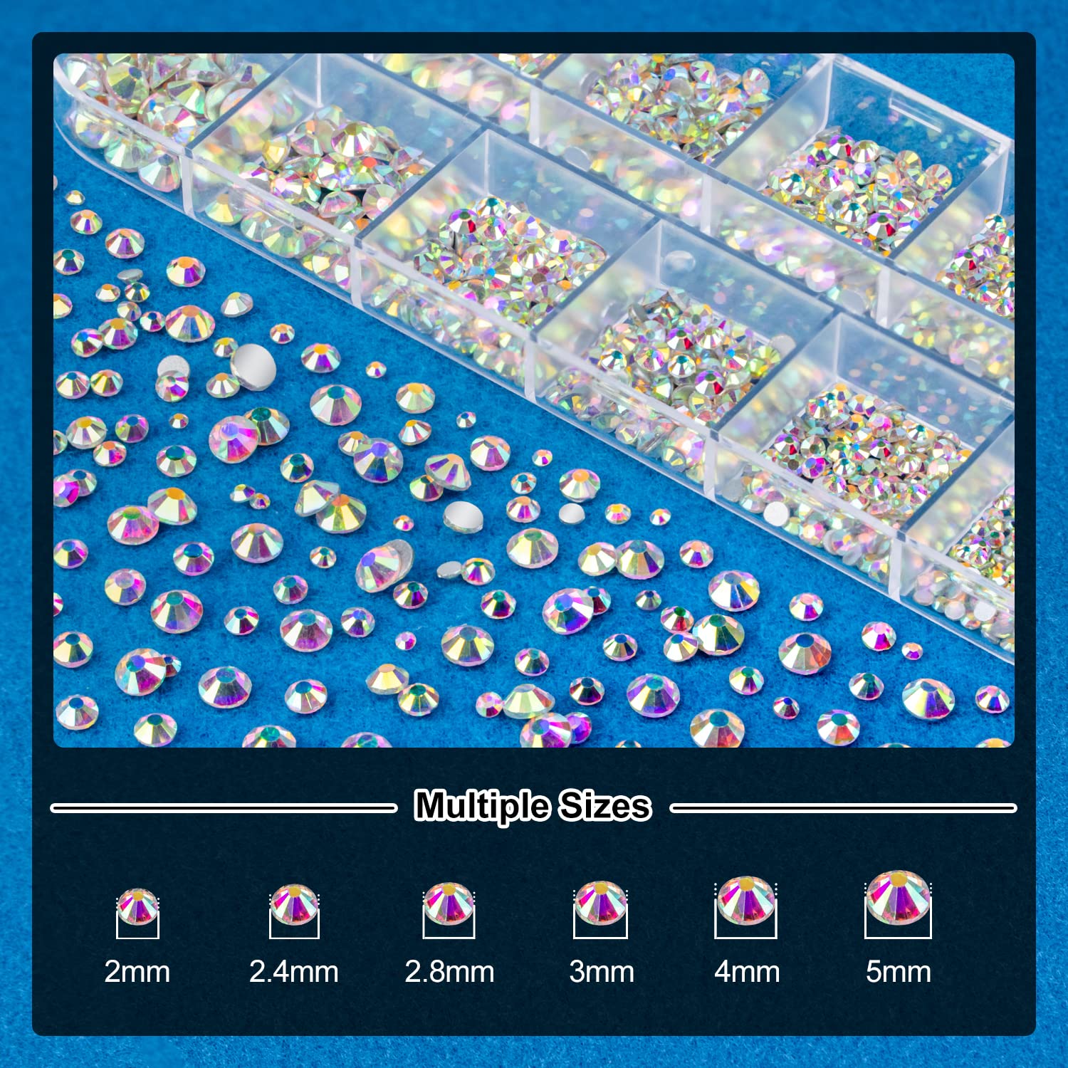 - 💎MULTIPLE SIZES: This set provides 2 boxes of Flat-back round glass crystal AB rhinestones with 6 sizes: 2mm、2.4mm、2.8mm、3mm、4mm、5mm; Great size range for your nail art decoration!