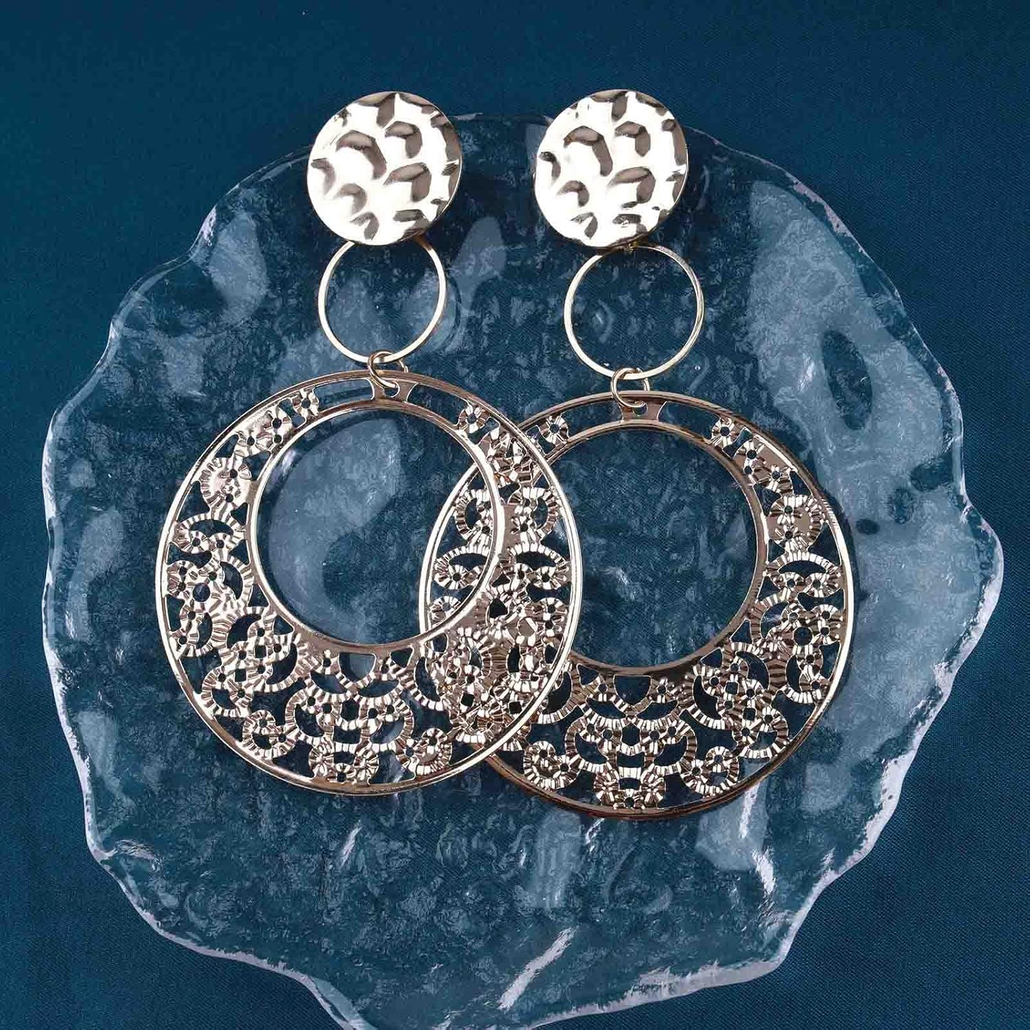 - 【Unique Design】This is a stylish bridal disc hoop earrings, dangle earrings with pattern cutout design, nightclub party earrings are very popular with girls.