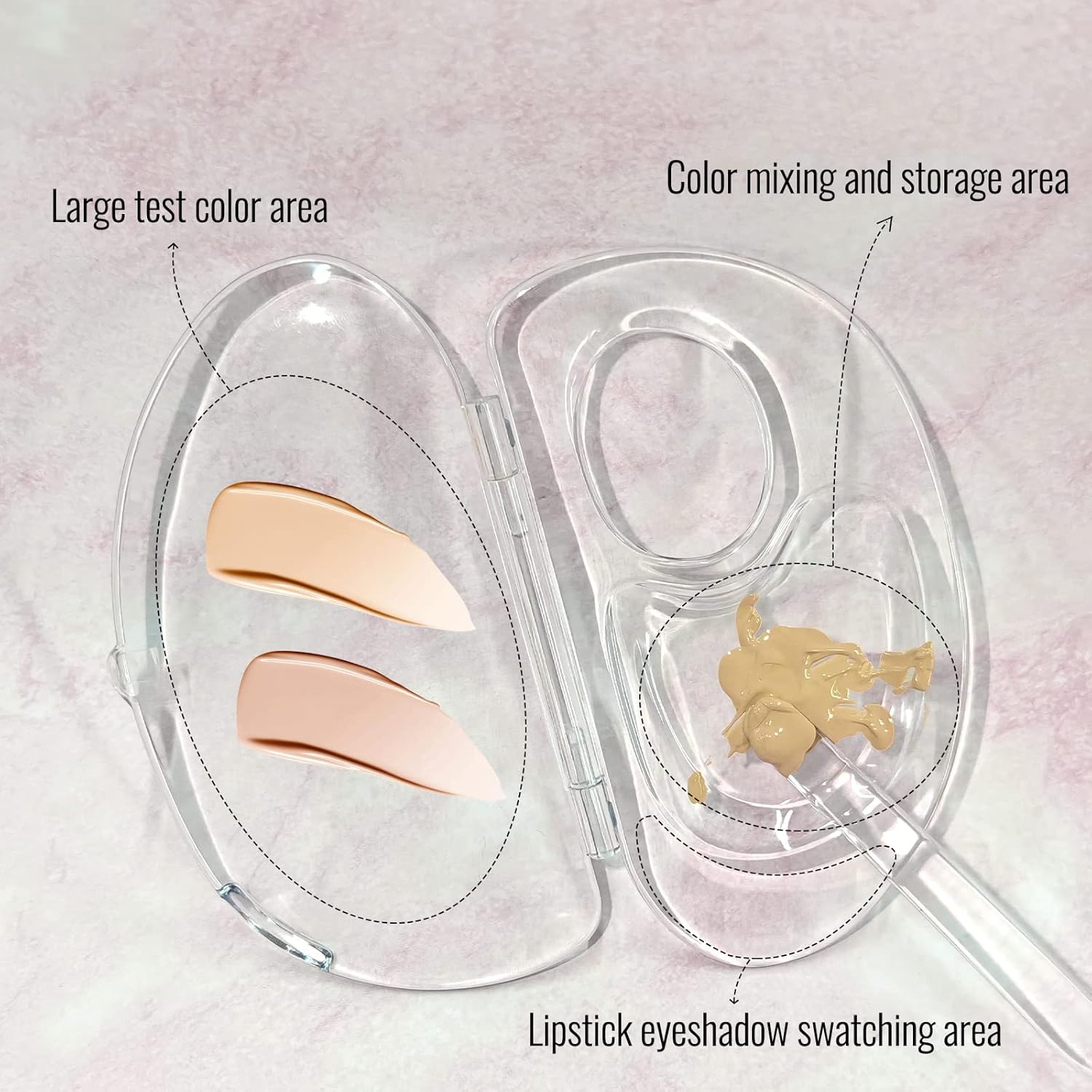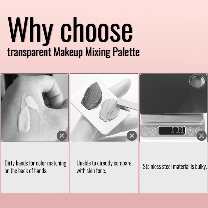 - 【PROFESSIONAL MAKEUP MIXING PALETTE】 The fully transparent color palette allows you to see whether the mixed color is consistent with your skin during makeup. With eye shadow and lip gloss color test areas on both sides of the product, you can quickly select colors to avoid repeated color tests and color-matching errors.