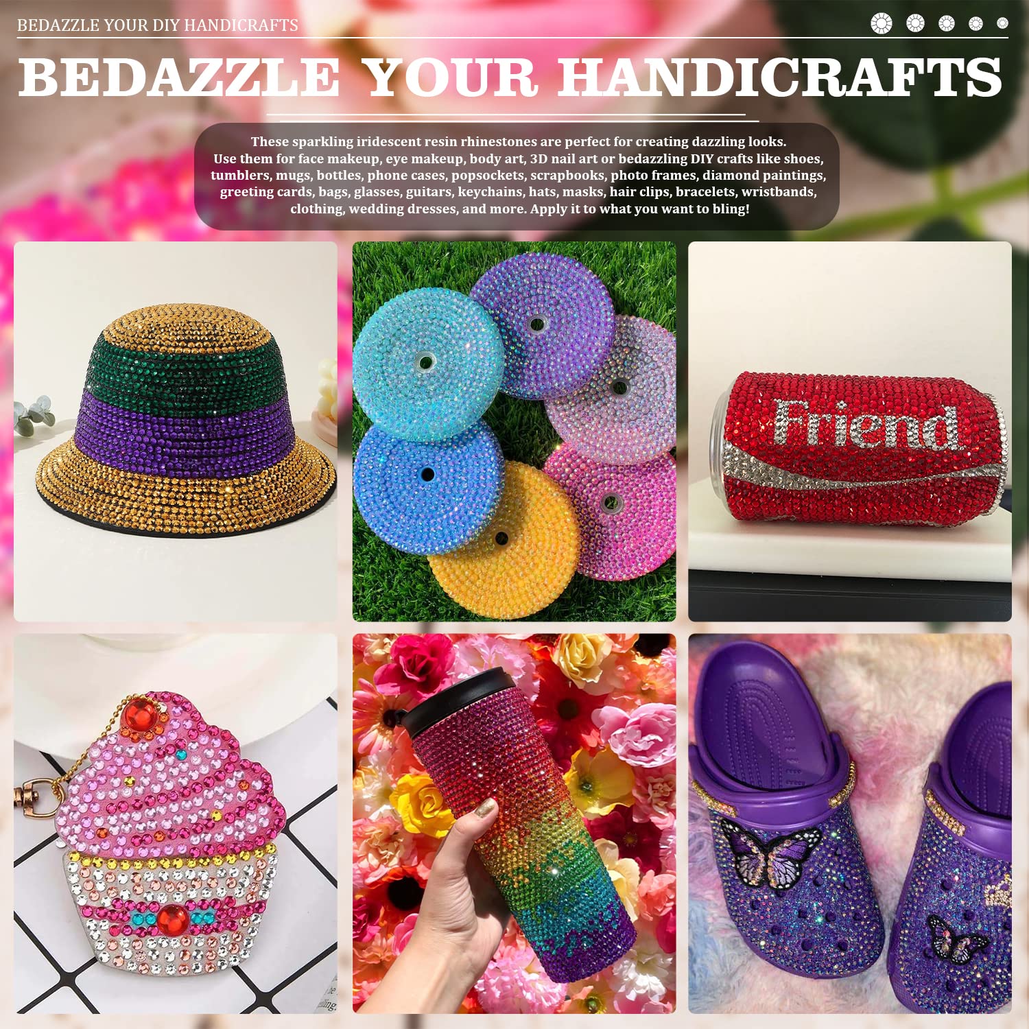 - 💎WIDE APPLICATION -- These sparkling iridescent resin rhinestones are perfect for creating dazzling looks. Use them for face makeup, eye makeup, body art, 3D nail art or bedazzling DIY crafts like shoes, tumblers, mugs, bottles, phone cases, popsockets, scrapbooks, photo frames, diamond paintings, greeting cards, bags, glasses, guitars, keychains, hats, masks, hair clips, bracelets, wristbands, clothing, wedding dresses, and more. Apply it to what you want to bling!