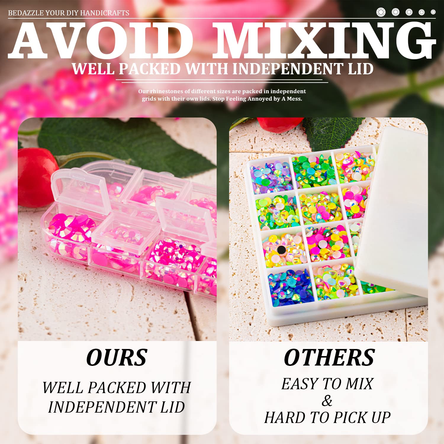 - 💎PACKAGE CONTENT -- This resin rhinestone kit includes 4 boxes, each with 12 grids, featuring a variety of sizes: Box #1/#2 contains 2mm x 1 grid, 3mm x 1 grid, 4mm x 3 grids, 5mm x 3 grids, and 6mm x 4 grids; Box #3/#4 contains 3mm x 3 grids, 4mm x 3 grids, 5mm x 3 grids and 6mm x 3 grids. A tweezer and a pickup pencil are included for easy rhinestone picking. This set offers more large-sized gems, making it perfect for DIY craft decorations, eye makeup, face makeup and nail art.