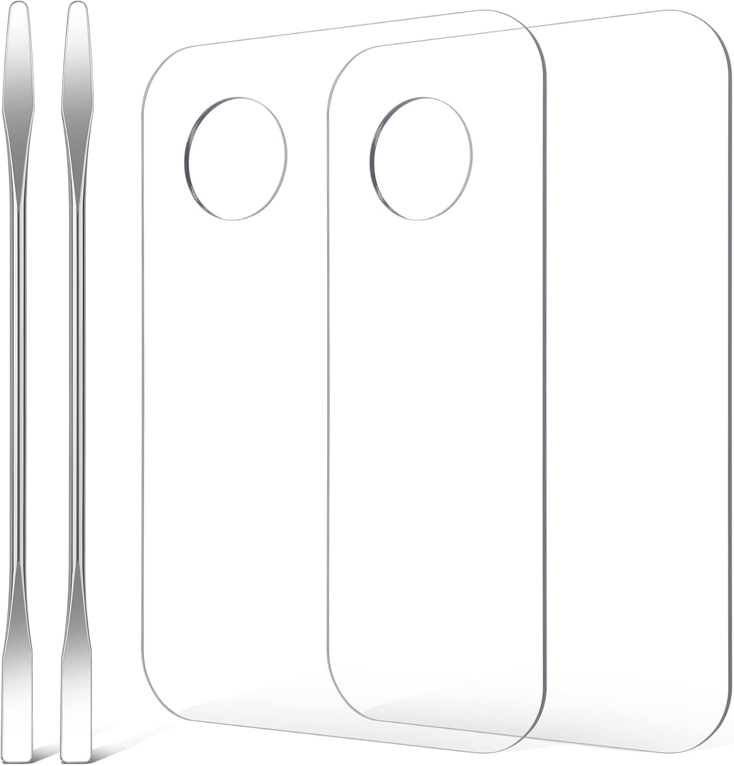 - Value set: 2pcs acrylic makeup mixing palettes and 2pcs stainless spatula, makeup mixing palette:15*10cm/5.9*3.9inch, makeup spatula:15cm/5.9inch. 2-ended spatula help get the product out of the container, more easily and sanitary, as well as avoid waste. Foundation mixing tray with a diameter of 1.0inch thumb hole for easy holding, not only keep hands clean during make-up but also reduce the possibility of your cosmetics getting dirty. Easy to carry and fit your makeup bag