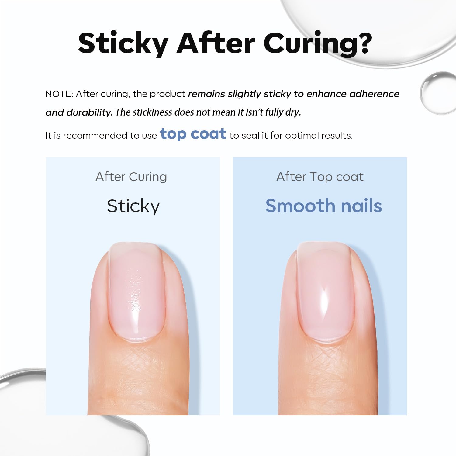 - Quick & Easy Application: High self-leveling formula along with built-in brush makes it easy to spread, help you create length, thickness or add strength to the nail you want, and ensure a smooth and natural nail foundation layer with impeccable shine. NOTE: It is normal for builder nail gel to remain a little sticky after curing, which will make a better adhesion between nails and gel layers. It is recommended to use top coat to seal it