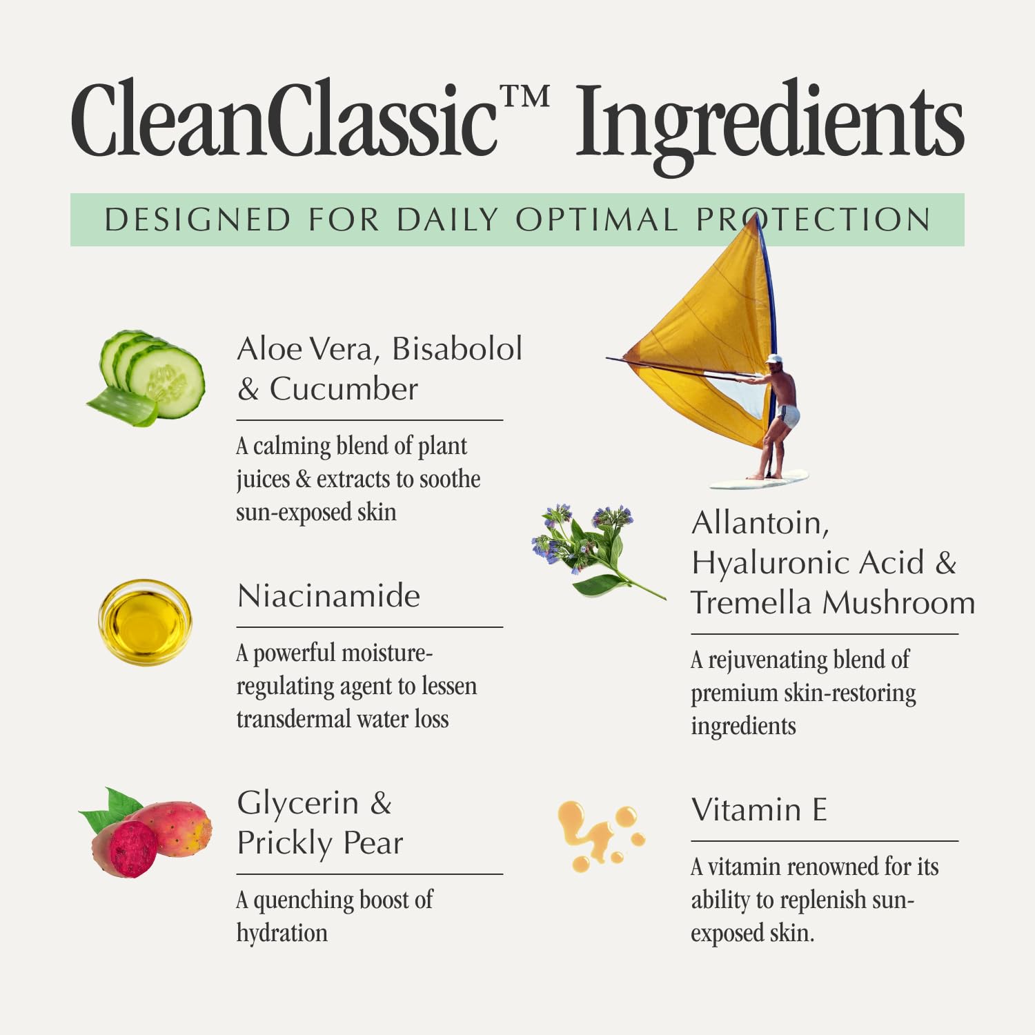 - HYDRATING SUN RELIEF - Features Aloe Vera with a restorative blend of Niacinamide, Glycerin and Prickly Pear o hydrate sun-drenched skin. Vitamin E, Allantoin, Hyaluronic Acid, and Tremella Mushroom helps prolong your summer glow and keep skin feeling soft, luxurious and smooth.