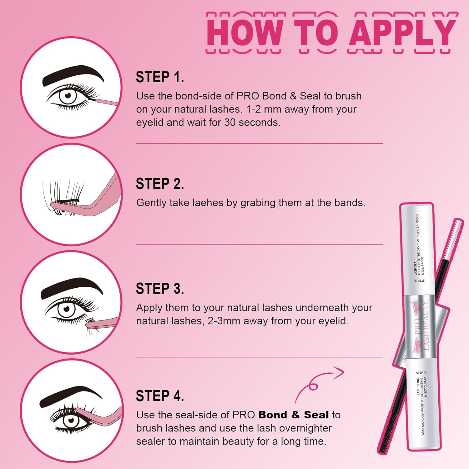 - Easy to Apply: Use the Bond-Side of PRO Bond & Seal to brush on your natural lashes. 1-2 mm away from your eyelid and wait for 30 seconds. And then ,gently take laehes by grabing them at the bands. After apply them to your natural lashes underneath your natural lashes, 2-3mm away from your eyelid. Finally, use the Seal-Side of PRO Bond & Seal to brush lashes and use the lash overnighter sealer to maintain beauty for a long time.