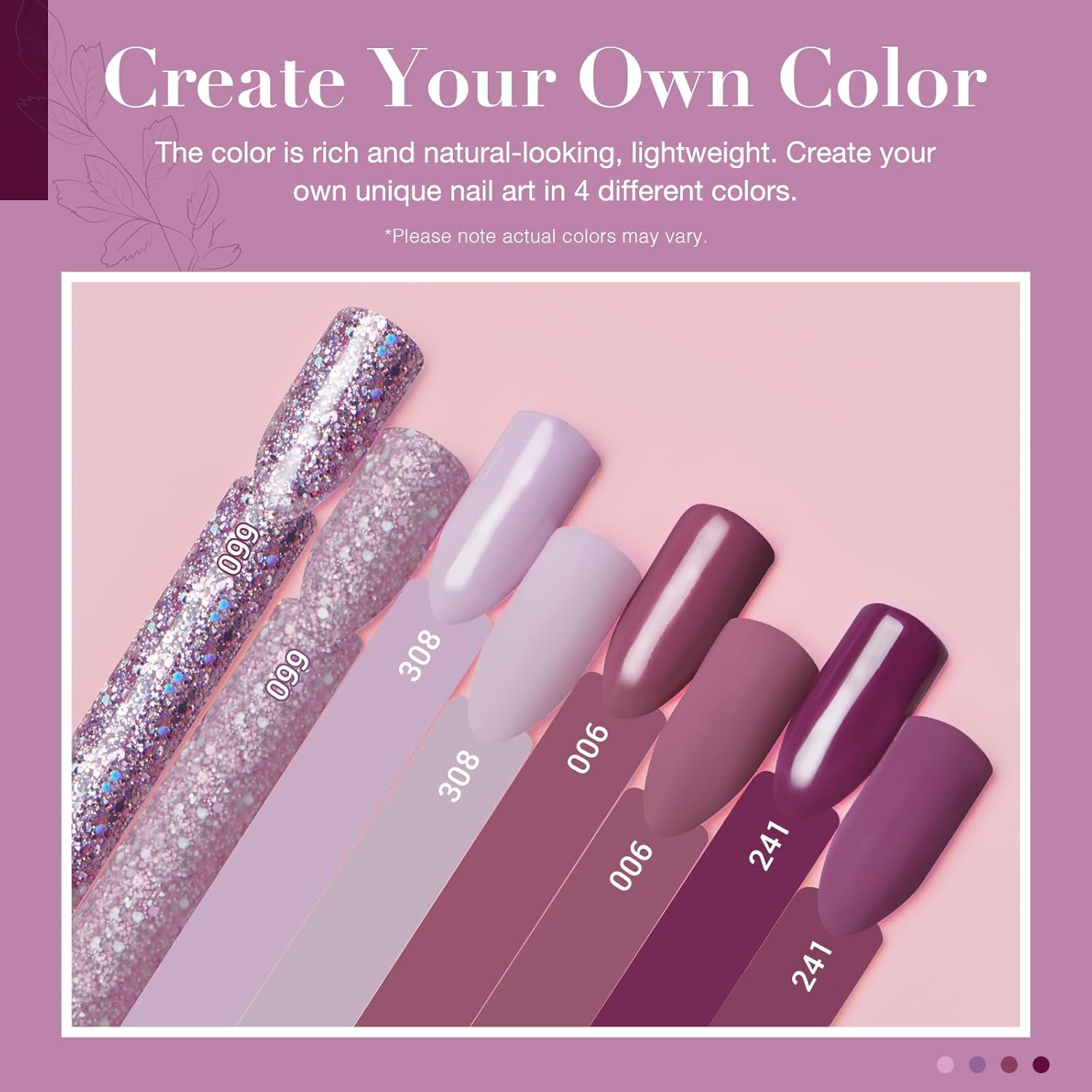 AZUREBEAUTY Dip Powder Nail Kit Dark Purple Lilac Purple Glitter 4 Colors Dip Liquid Set with Base/Top Coat Activator for French Art Manicure DIY Gift