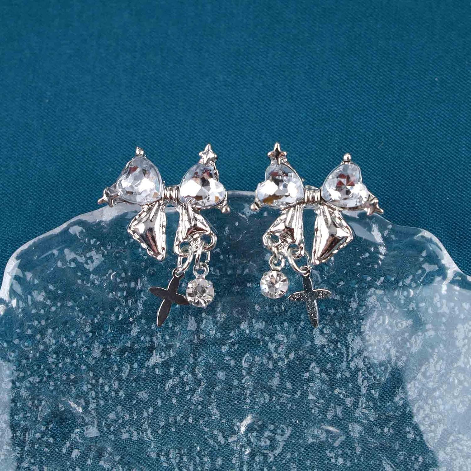 - Crystal bow dangle earrings.Item Details:Handmade Item.Size:As Shown.Color:Silver.Materials:Quality Alloy/Crystal.Location:Ear.Style:Boho/Vintage.