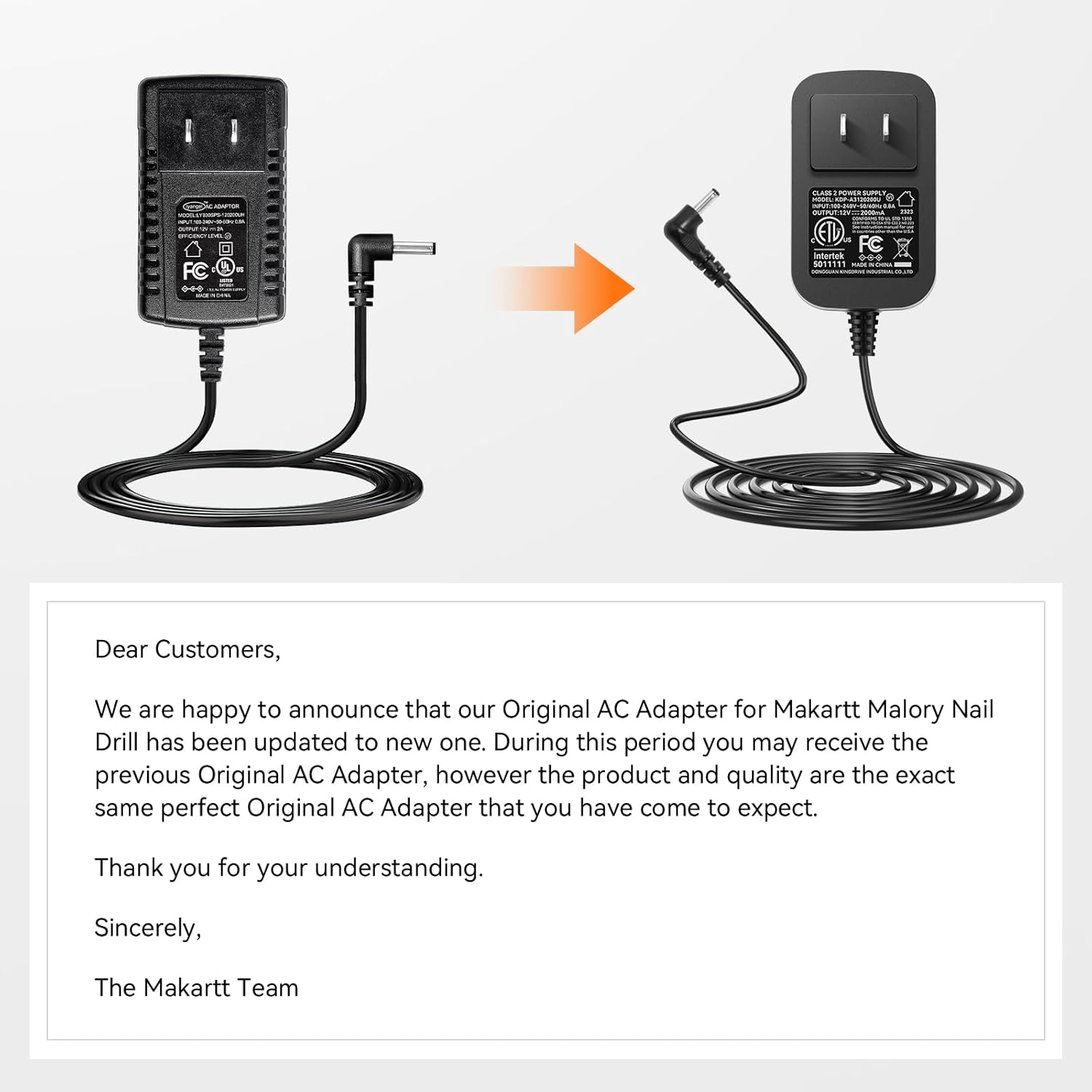 Makartt Original Power Charger Adapter for Malory Nail Drill, 12V 2A AC Battery Supply Cord for 30000RPM Rechargeable Electric File Manicure Tech Art Salon Home DIY Use