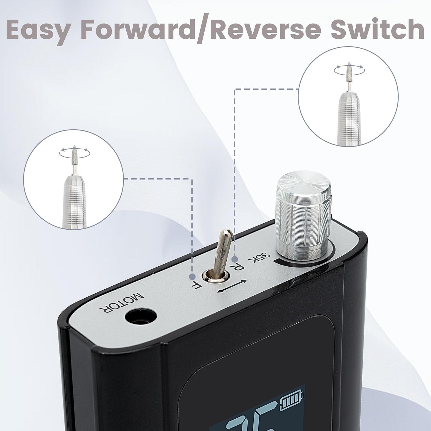 - Portable & Versatile: The rechargeable nail drill allows you to work with it anytime, anywhere without the restriction of outlet. The 12v output makes it even more powerful than most stationary nail drills and works faster on acrylics, gels and dips