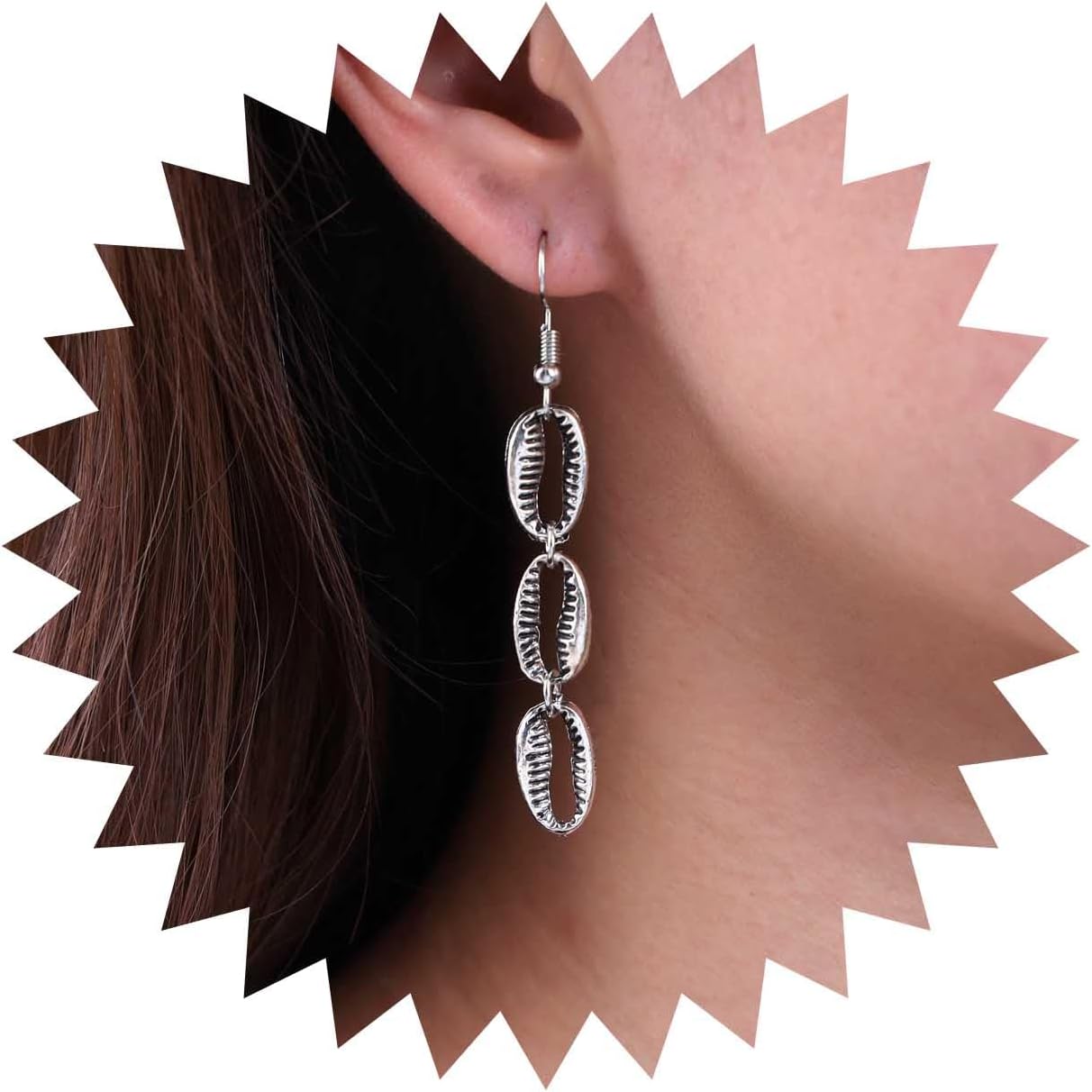 - Cowrie dangle earrings.Item Details:Handmade Item.Size:As Shown.Color:Silver.Materials:Quality Alloy.Location:Ear.Style:Boho/Vintage.
