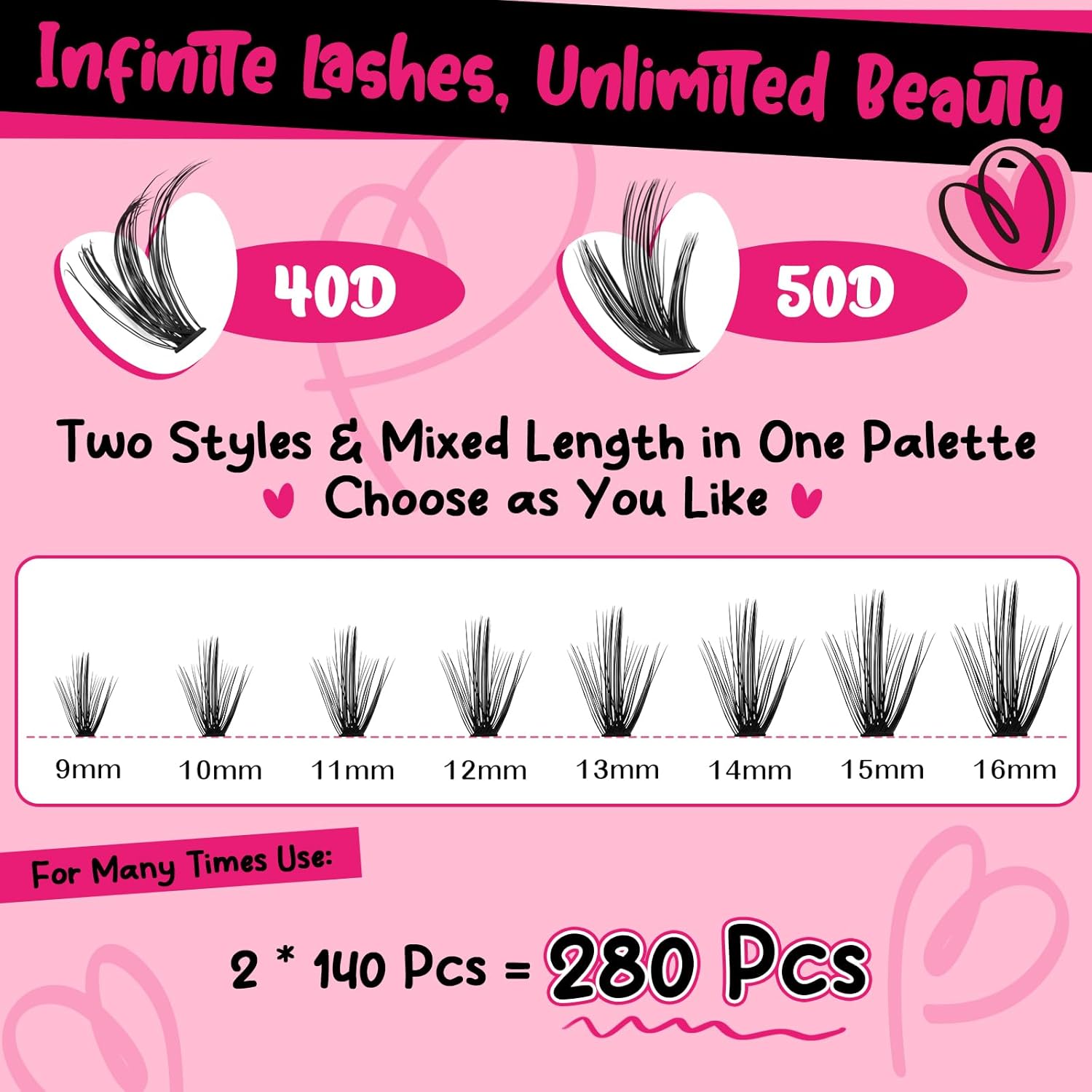 Lash Clusters Kit 280pcs Lash Clusters D Curl Eyelash Extension Kit Individual Lashes with Lash Bond and Seal Lash Remover Lash Applicator Easy to Apply at Home(40D+50D-9-16mix Kit)
