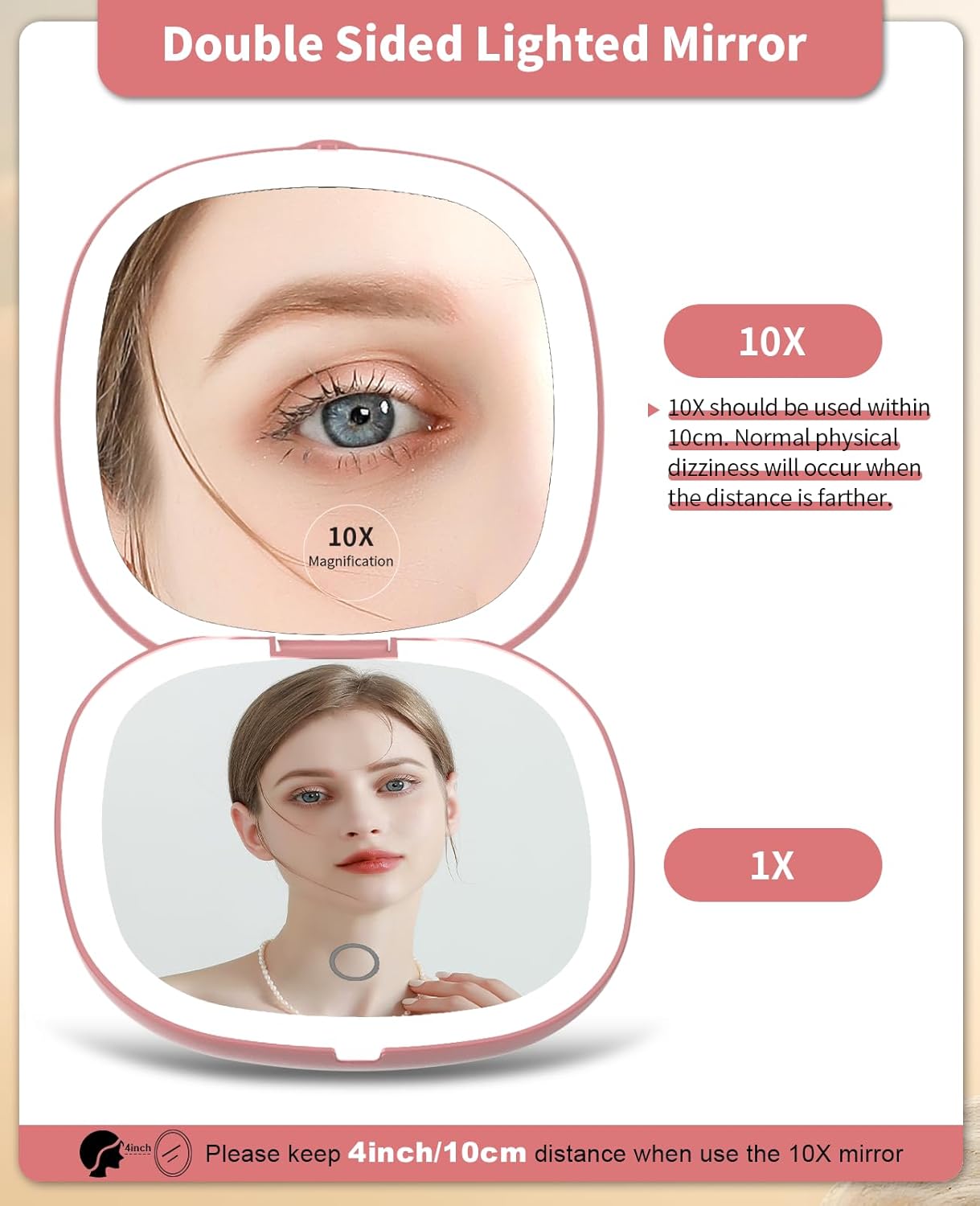 WOBSION Rechargeable Lighted Travel Makeup Mirror,1x/10x Compact Magnifying Mirror with Lights,Portable for Bag,4inch,Gift,Rose Gold