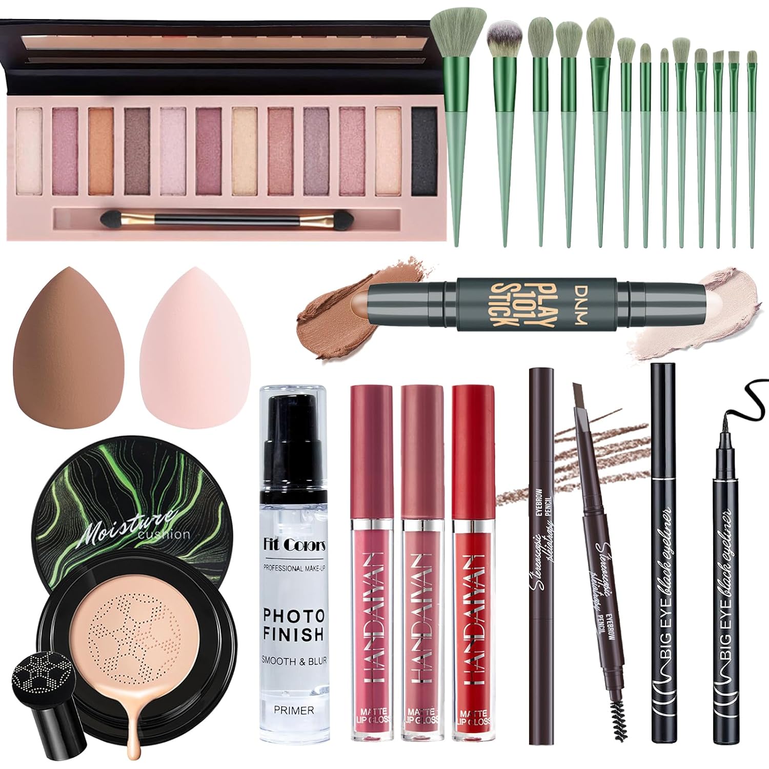 - [Makeup Set] The Christmas makeup present set for women includes shimmer 12 Colors Eyeshadow Palette, Natural Mushroom Head Air Cushion CC Cream, 3PCs Liquid Lipsticks, Face Primer, Dual-Ended Counter Stick, Dual-ended Eyebrow Pencil, Waterproof Eyeliner, 13PCs Makeup Brushes & 2PCs Makeup Sponges. It can meet all the beginners’ or professional makeup artists’ needs for daily makeup.