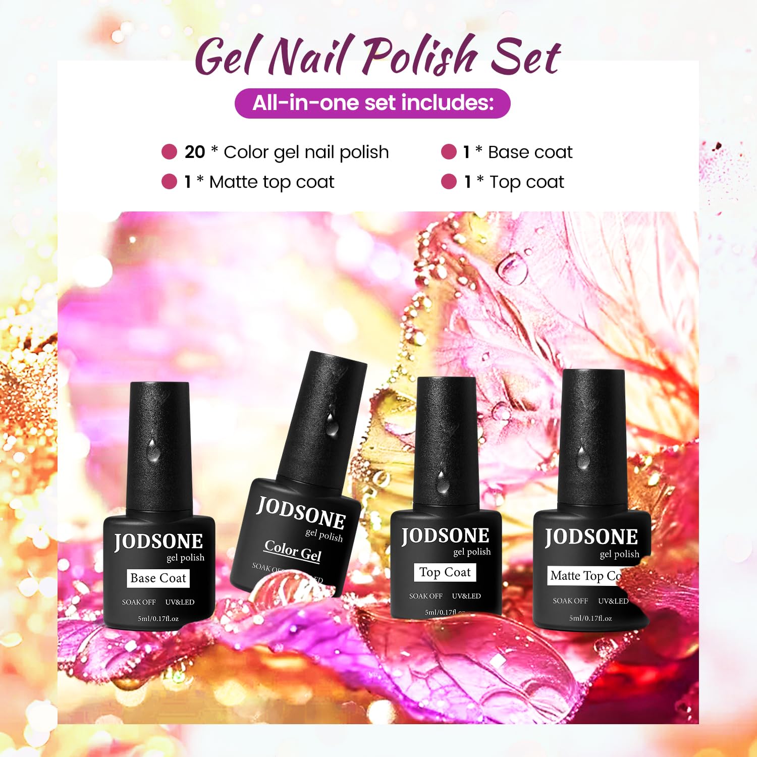 JODSONE 23 Bottles of Glitter Colorful and Elegant Gel Polish kit with 3 Bottles of Matte and Glossy Top Coat Base Coat Gel Nail Set