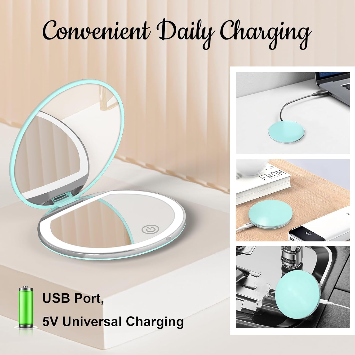 - [Stay Beautiful All The Time]--Our pocket mirror is lightweight, compact, easy to carry, and equipped with a USB cable, so you don't have to worry about changing batteries at any time. It is the perfect companion for you on the road. Whether in between makeup sessions or on the go, it can create a sophisticated and flawless look, allowing you to look confident and beautiful in any occasion.