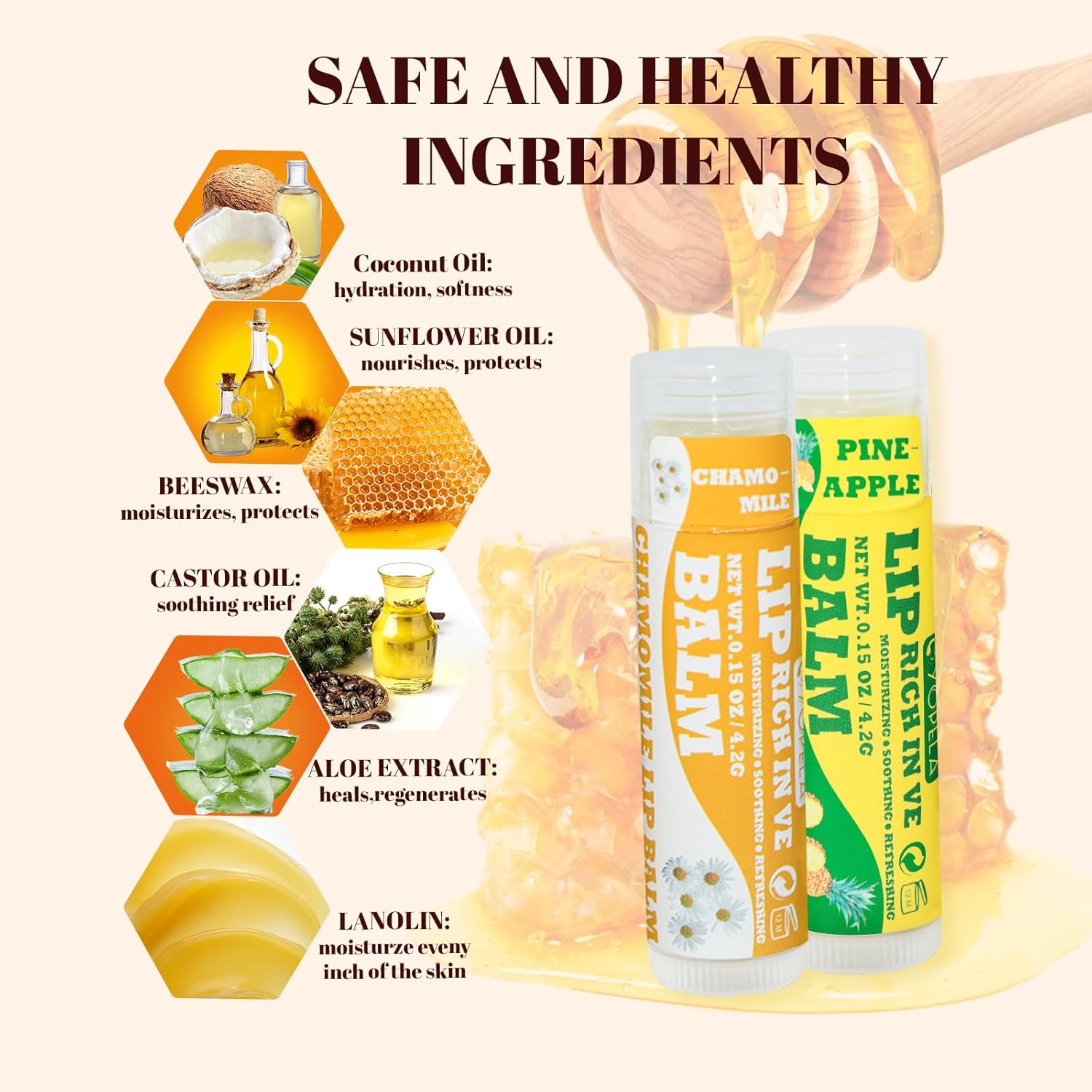 - Pure Natural Ingredients - Our lip balm is crafted with organic sunflower oil, beeswax, coconut oil, and a blend of natural flavors and essential oils, including vitamin E, rosemary extract, and calendula extract. Experience the ultimate lip care without any chemicals or fillers