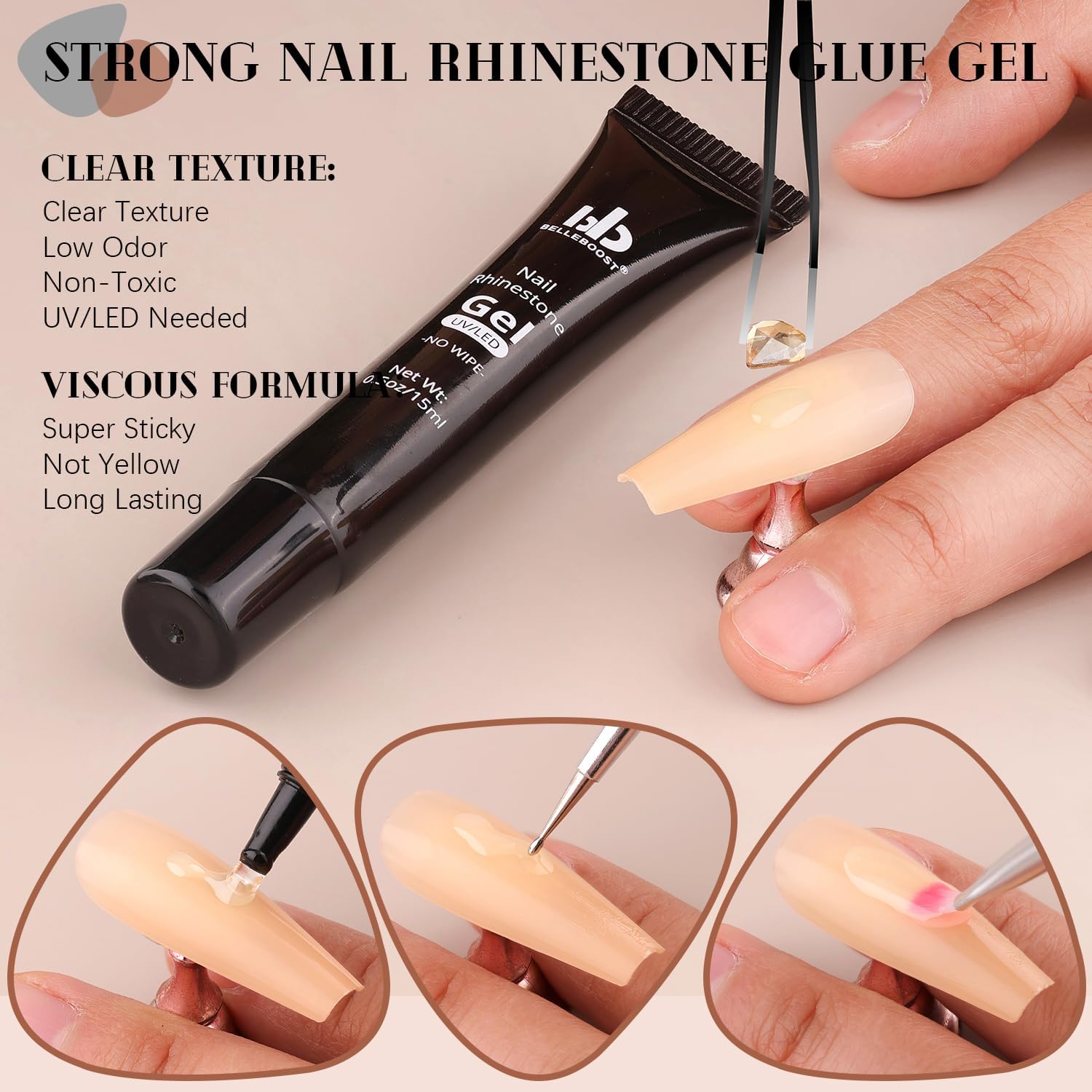 - 💎ADHESIVE GEL GLUE: The rhinestones glue gel uses a special, non-toxic and eco-friendly formula with strong tackiness, adhesion, and fluidity for easily applying decorations. It is a type of UV gel glue. After proper curing under a UV/LED lamp, the glue dries clear with superior bonding strength that can last a few weeks without falling off. With the designed tip, you can easily and conveniently apply the glue to the nail bed or the surface of false nails.