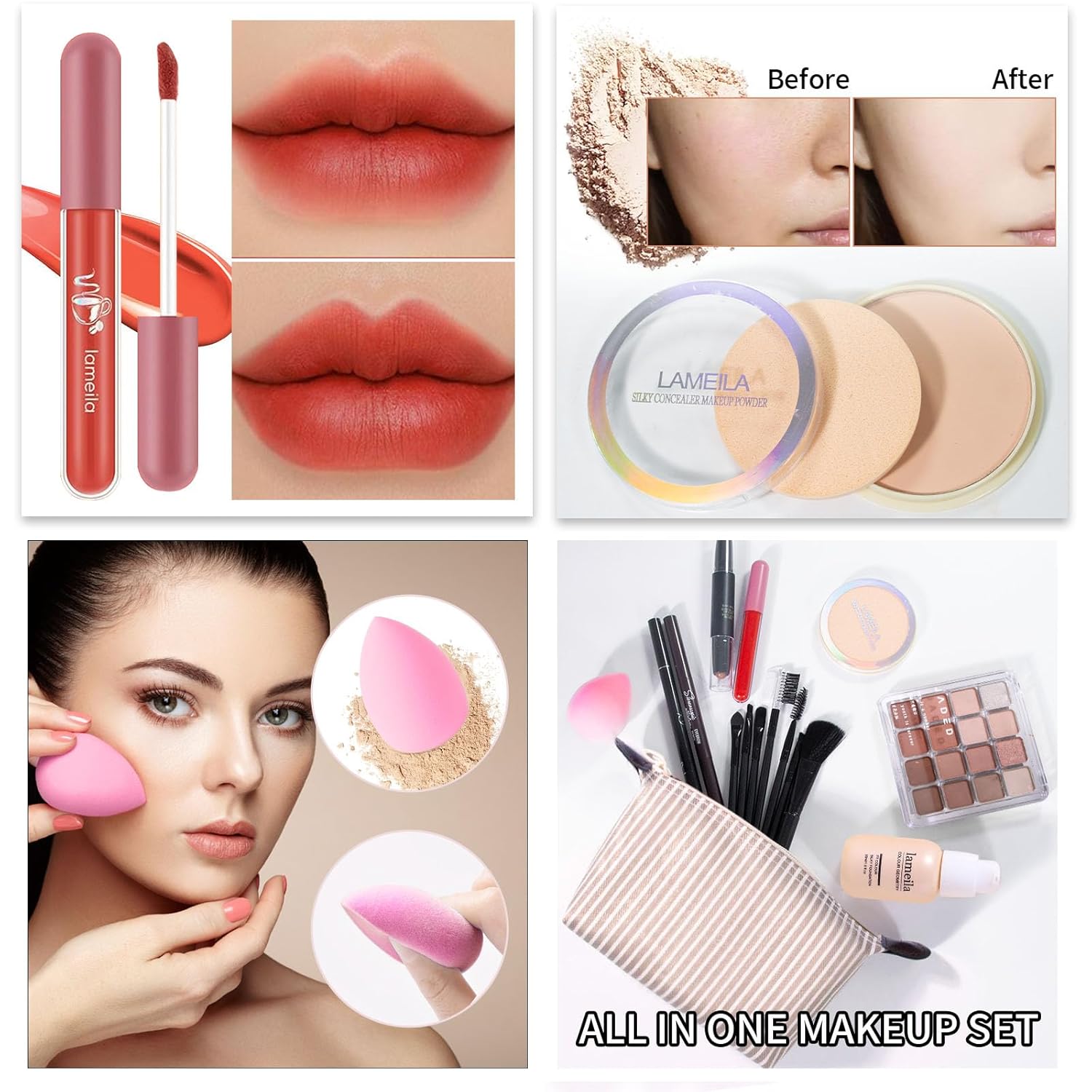 Makeup Set Full Kit for Girls Teens Women, Makeup Present Set, Includes Eyeshadow, Foundation, Blusher, Eyebrow Pencil, Mascara, Eyeliner, Brushes, Lip Gloss, Sponge, Cosmetic Bag