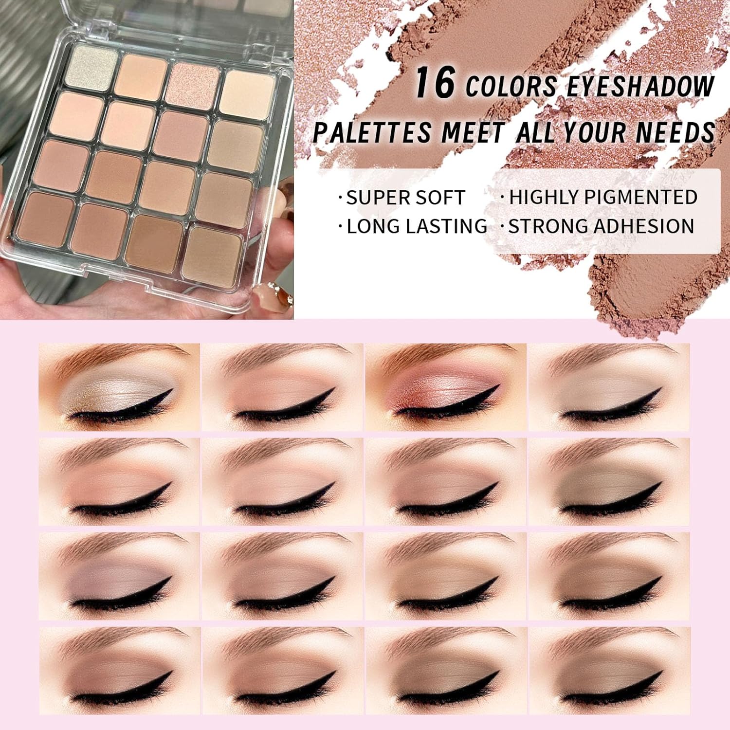- [ Makeup Set] The perfect starter makeup kit includes 16 colors eyeshadow palette, full coverage liquid foundation, face blusher, dual-ended Eyebrow Pencil, Mascara, Eyeliner, lip gloss, 7 PCs makeup brushes set, makeup sponge, high-quality material cosmetic bag. All women’s makeup essentials are put in one gorgeous cosmetic bag.