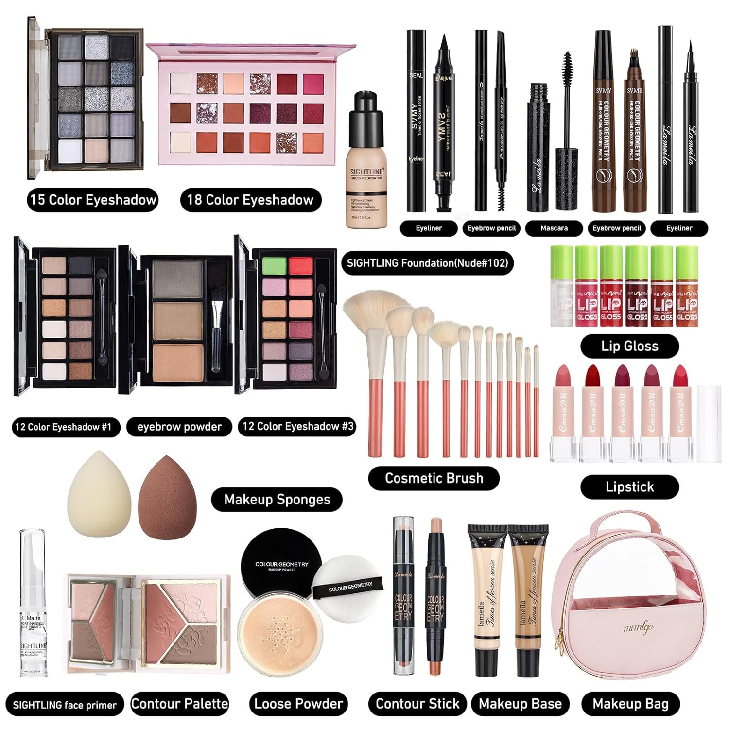 All In One Makeup Kit, Travel Makeup Kit, Makeup Gift Set, Makeup Kit for Women Full Kit, Makeup Bundle Includes Foundation Eyeshadow Palette Lipstick Eyeliner Mascara Contour Stick Cosmetic Brush Set
