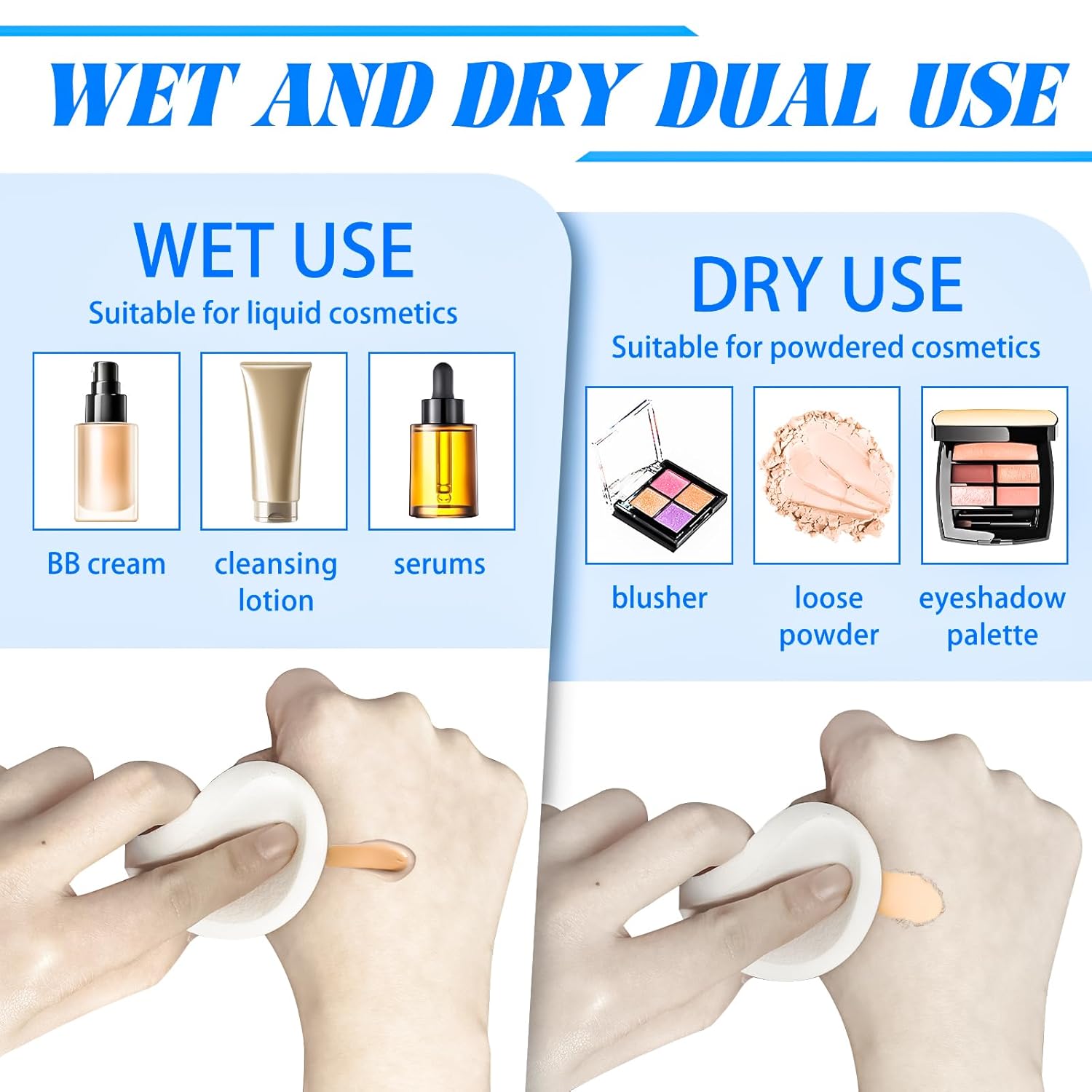 - Recommended Uses For Product : Both wet and dry application. Suitable for powder, cream or foundation, can be used for all makeup types Both wet and dry application. Suitable for powder, cream or foundation, can be used for all makeup types
