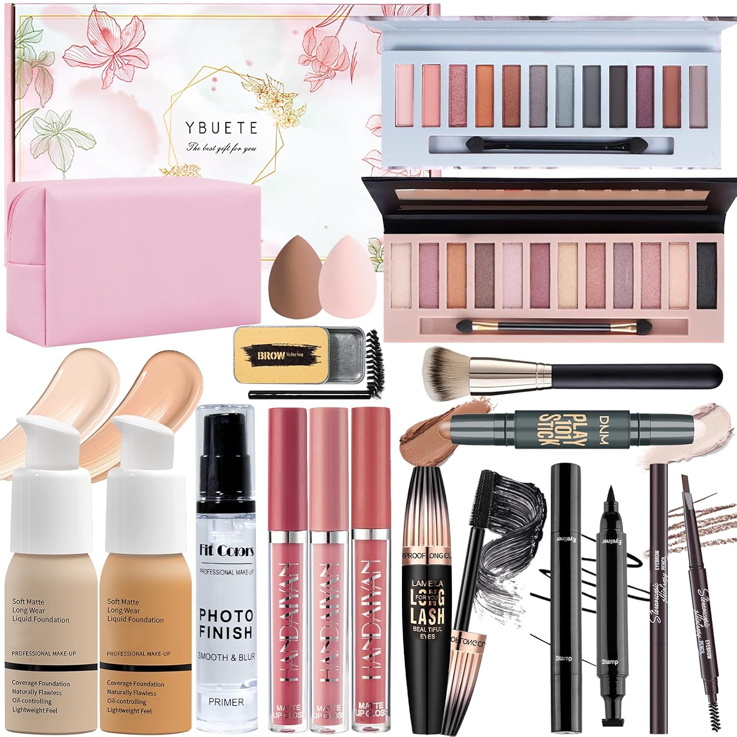 - [Full Face Makeup Set] The multipurpose makeup gift set for women includes Full Coverage Nude & Buff Beige Foundation, Matte & Shimmer 12 Colors Eyeshadow Palette, 3pcs Liquid Lipsticks, Face Primer, Dual-Ended Counter Stick, Waterproof Cosmetic Bag, Eyebrow Soap set, Dual-ended Eyebrow Pencil, Winged Eyeliner Stamp, Waterproof Mascara, Makeup Brush & 2PCs Makeup Sponges. It can meet all the beginners’ or professional makeup artists’ needs for daily makeup.