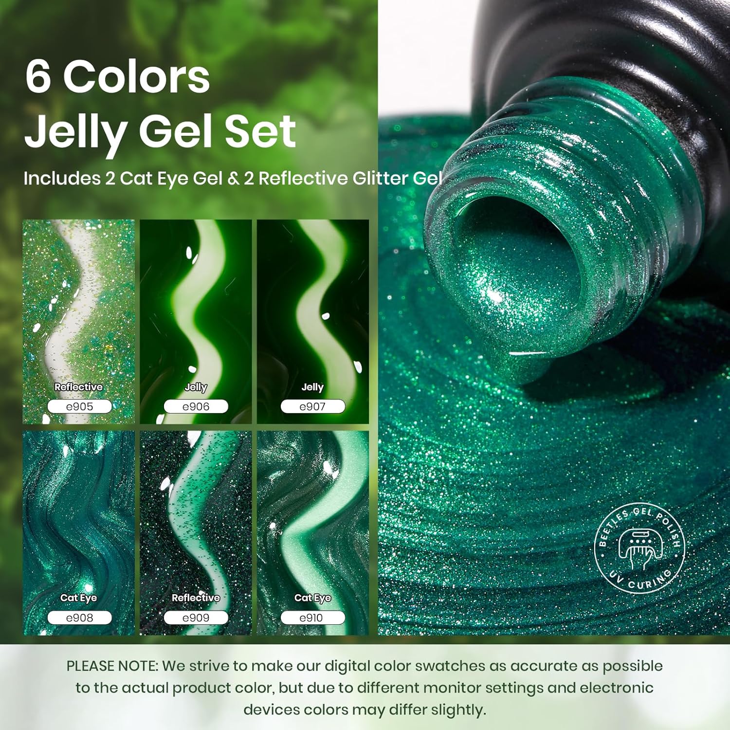 - Sheer Gel Polish: Jelly-like green nail polish gel set, the collection of the most popular green, flash color, cat eye, like a fairy tale fantasy,These colors have been carefully selected to suit any occasion, season, and outfit. Tips for Cat Eye Gel Polish: Place the magnetic stick over the surface about 3-5mm for 5-10 secs to get your desired effect!!!! Color Number: e905-e906-e907-e908-e909-e910