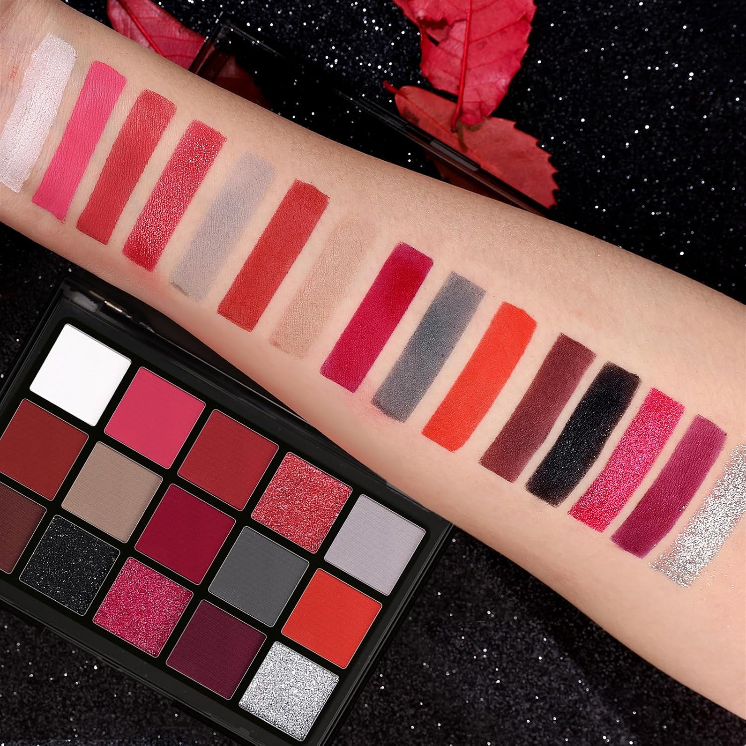 UCANBE Red Eyeshadow Makeup Palette, 15 Colors Burgunry Gray Silver Shimmer Matte Glitter Metallic Eye Shadow Pallet, Pigmented Make Up Kit for Halloween Parties Christmas Joker Vampire Clown
