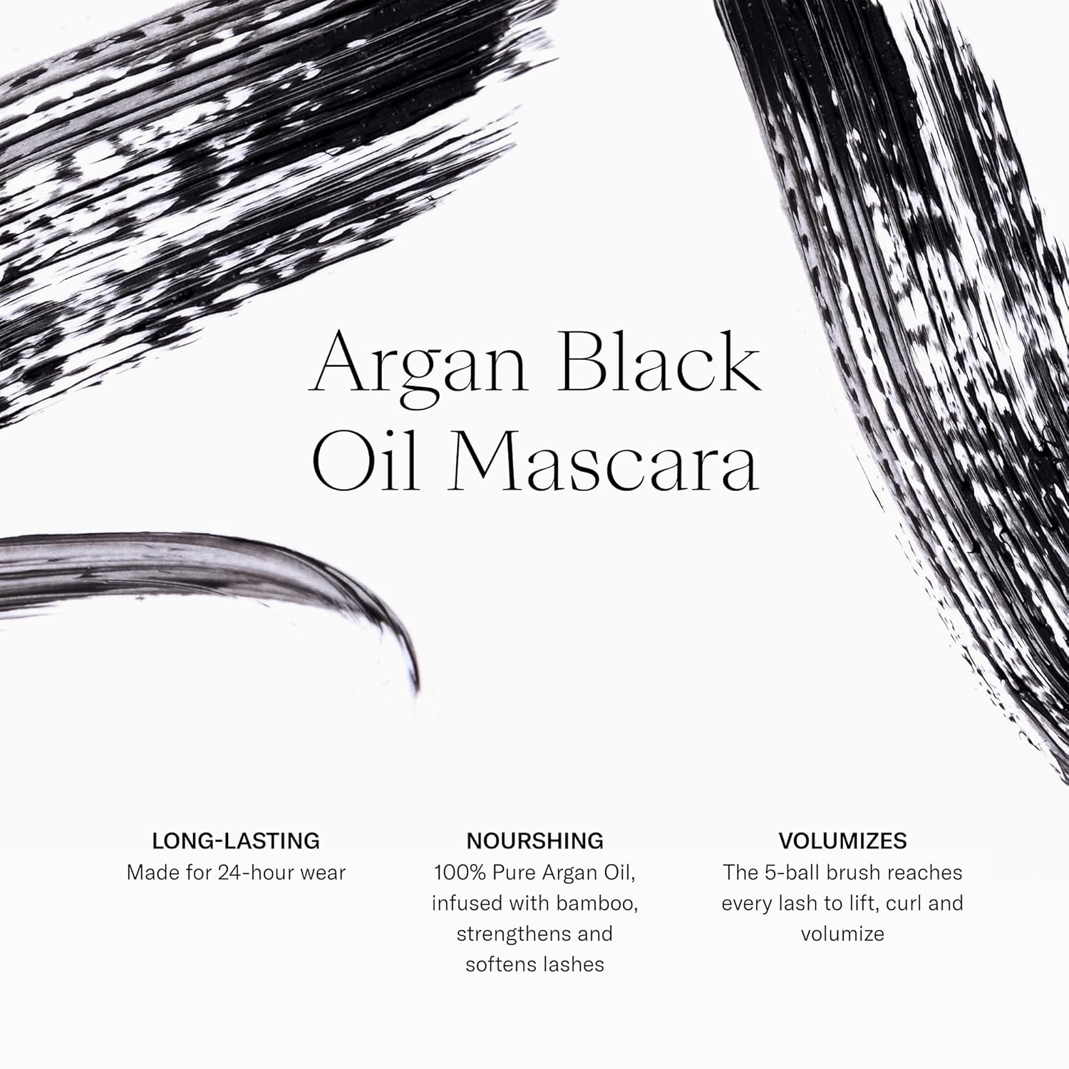 - Natural, 24-Hour Wear - Our voluminous mascara coats each individual lash, making them appear longer and fuller. Made with 100% Pure Argan Oil to condition lashes and a 5-ball brush to volumize, lift & curl.
