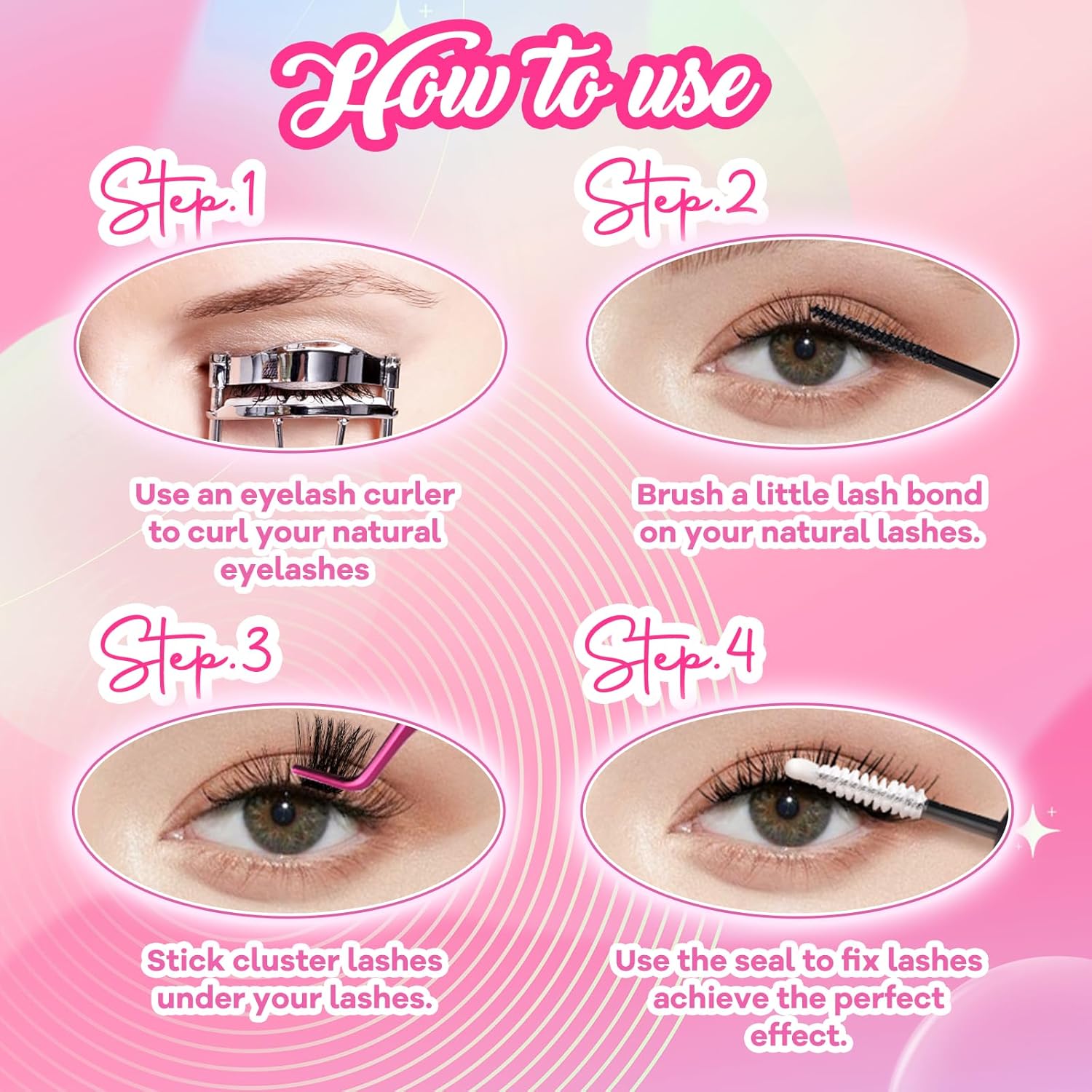 - DIY individual clusters at home: Step 1: Gently curl your lashes. Step 2: Pick up the lash clusters with lash tweezer. Step 3: Apply cluater lash glue. Step 4: Wear cluster lashes according to your preference.
