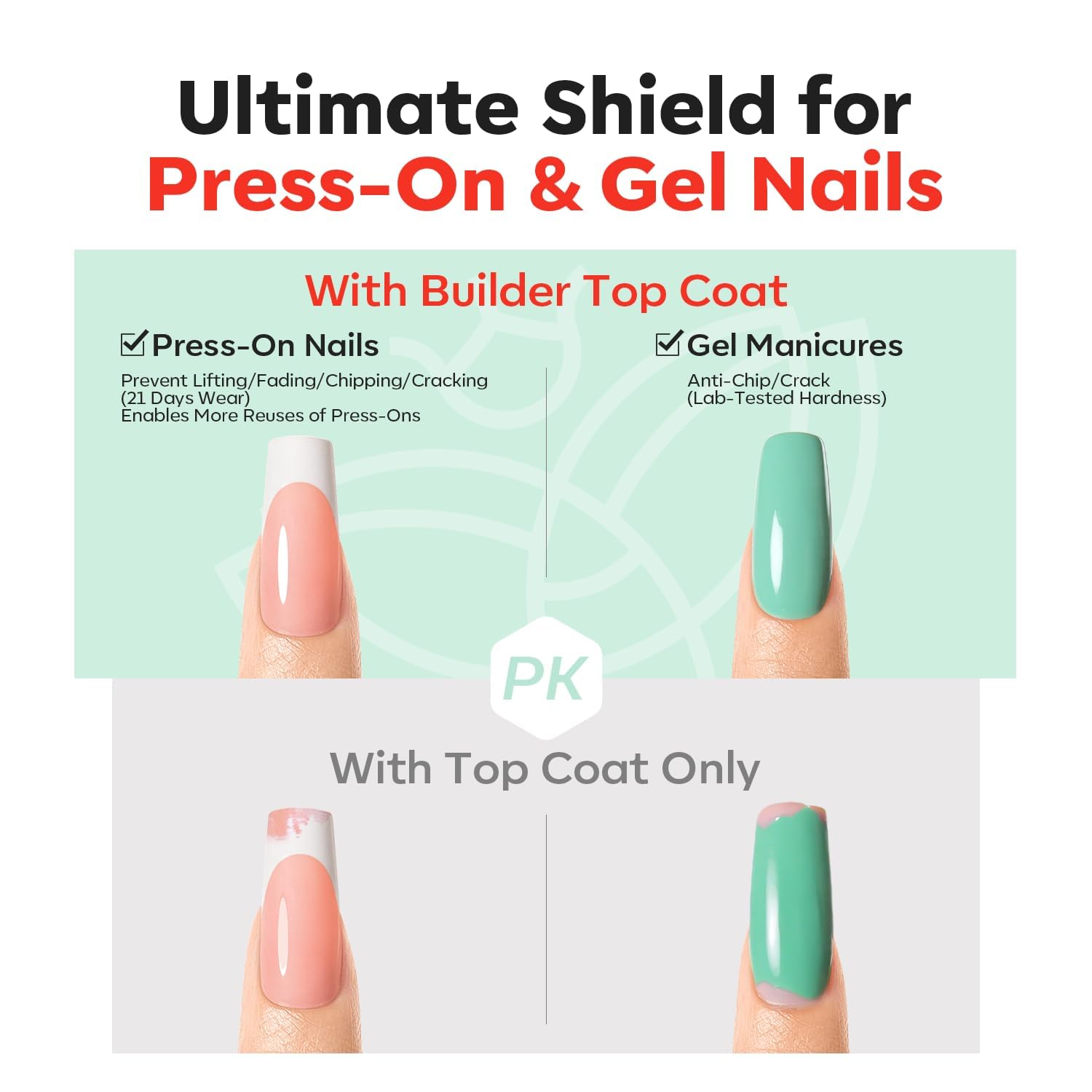 - 【Versatile Use】 Perfect for both full nail extensions and as a top coat for wearable nails. It can be applied over gel, press on nails, french tips press on nails,fake nails or acrylic nails for an extra layer of protection and shine