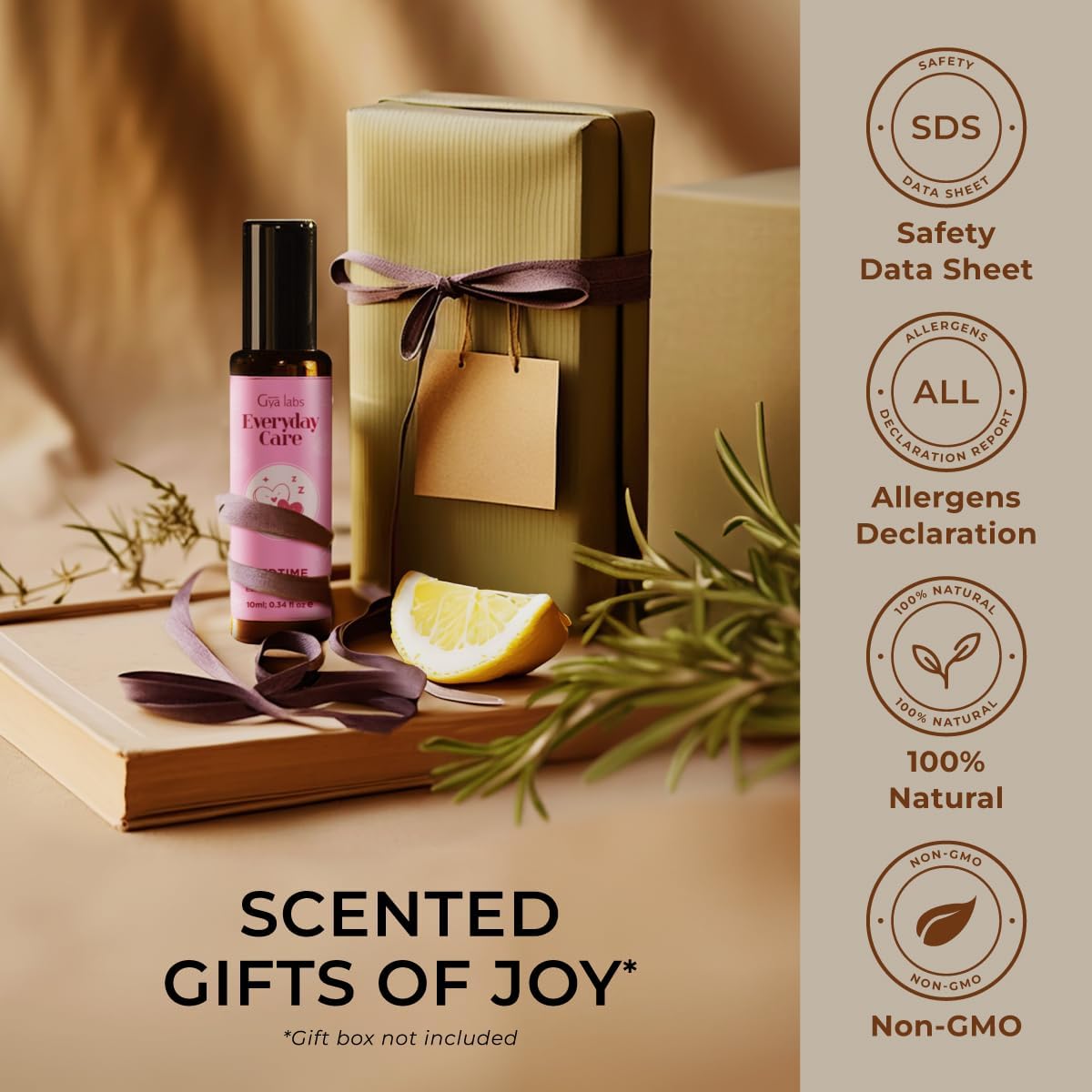 - Expertly Bottled & Packaged. Gya Labs’ Bedtime Oil Roll On is packaged in a glass amber bottle to ensure purity. Our Gya Labs essential oil roll on are also carefully handled, not tested on animals and undergo strict quality control .